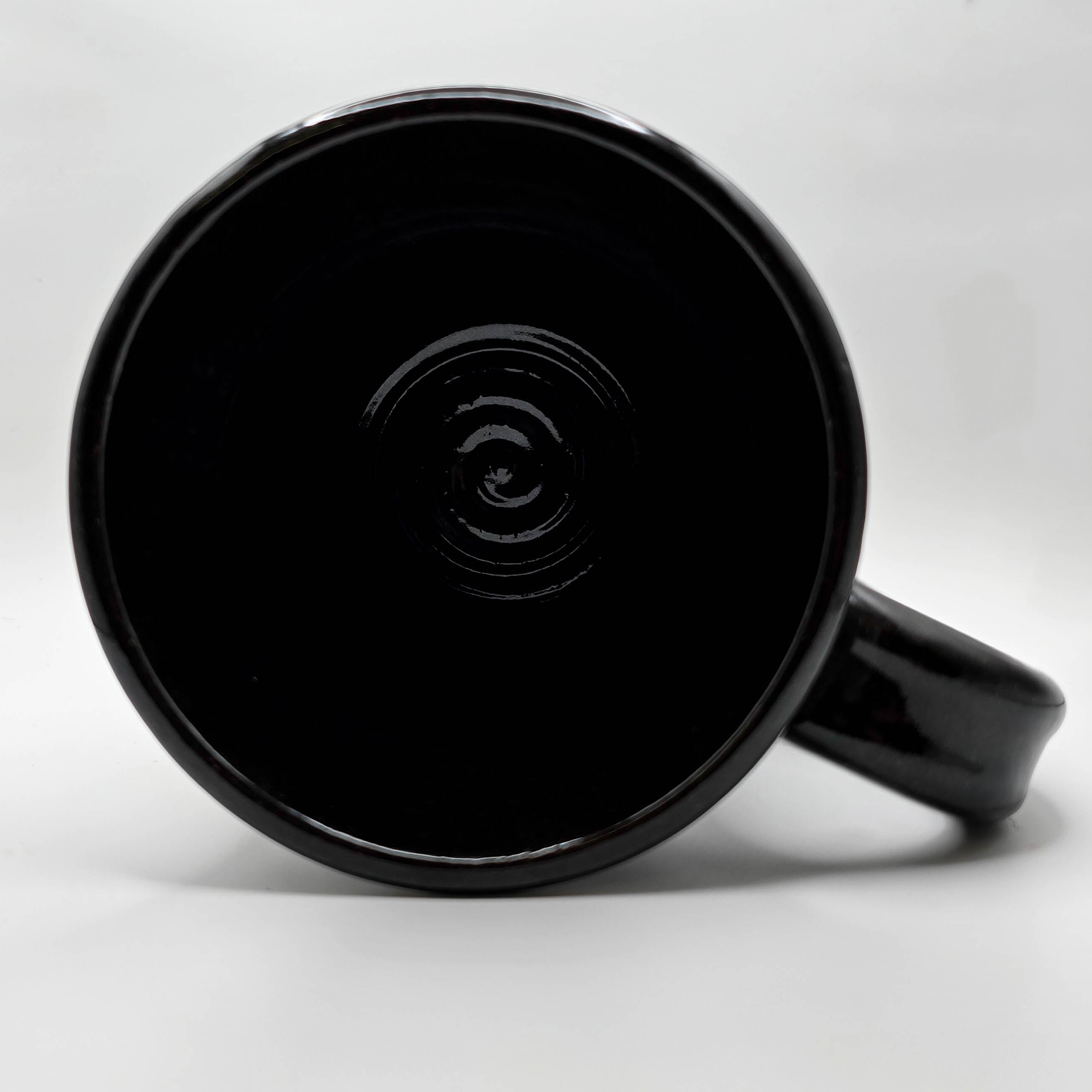 Nothing will brighten up a morning more than this happy-go-lucky vessel filled with coffee. The natural clay texture next to the super polished black glaze make a beautiful contrast of feelings. Can be calming on those stressful mornings.