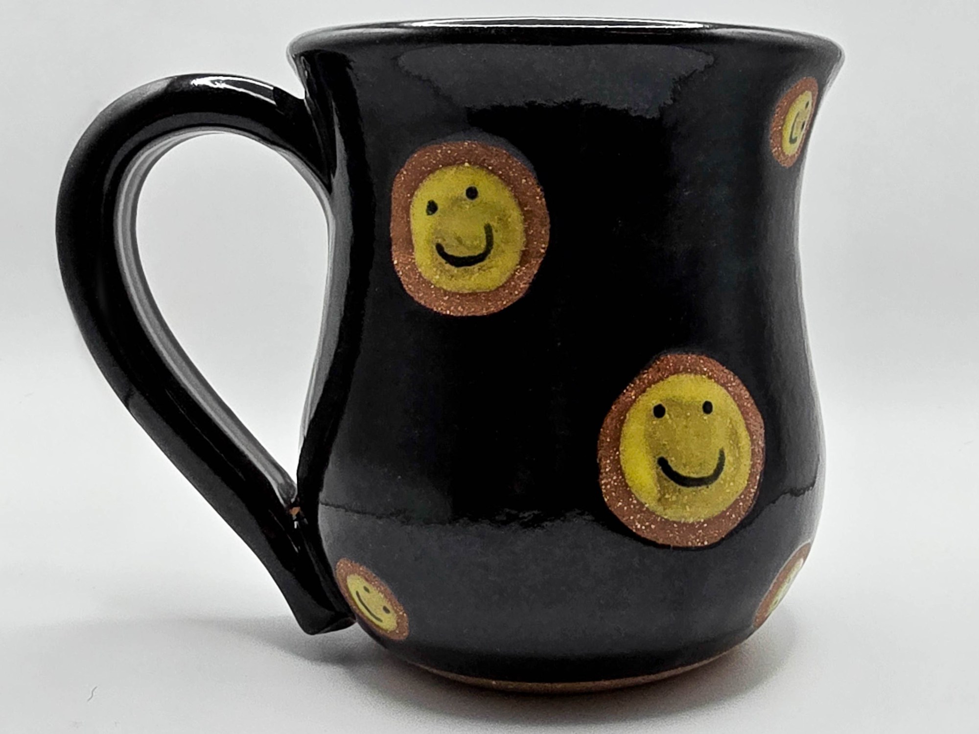 A Happy Mug, textured smiley motif, Stoneware glazed in Black. approx.12-14 oz.