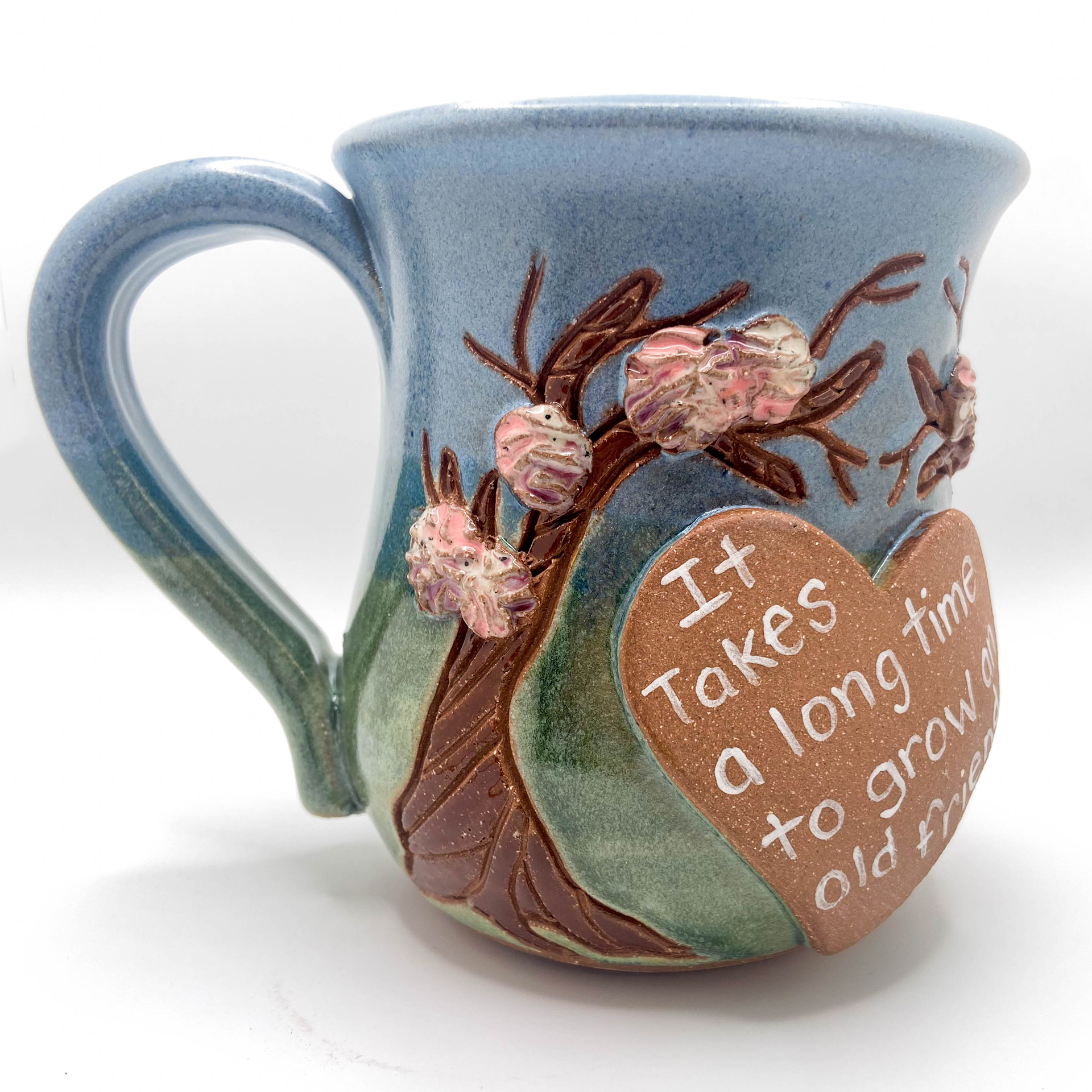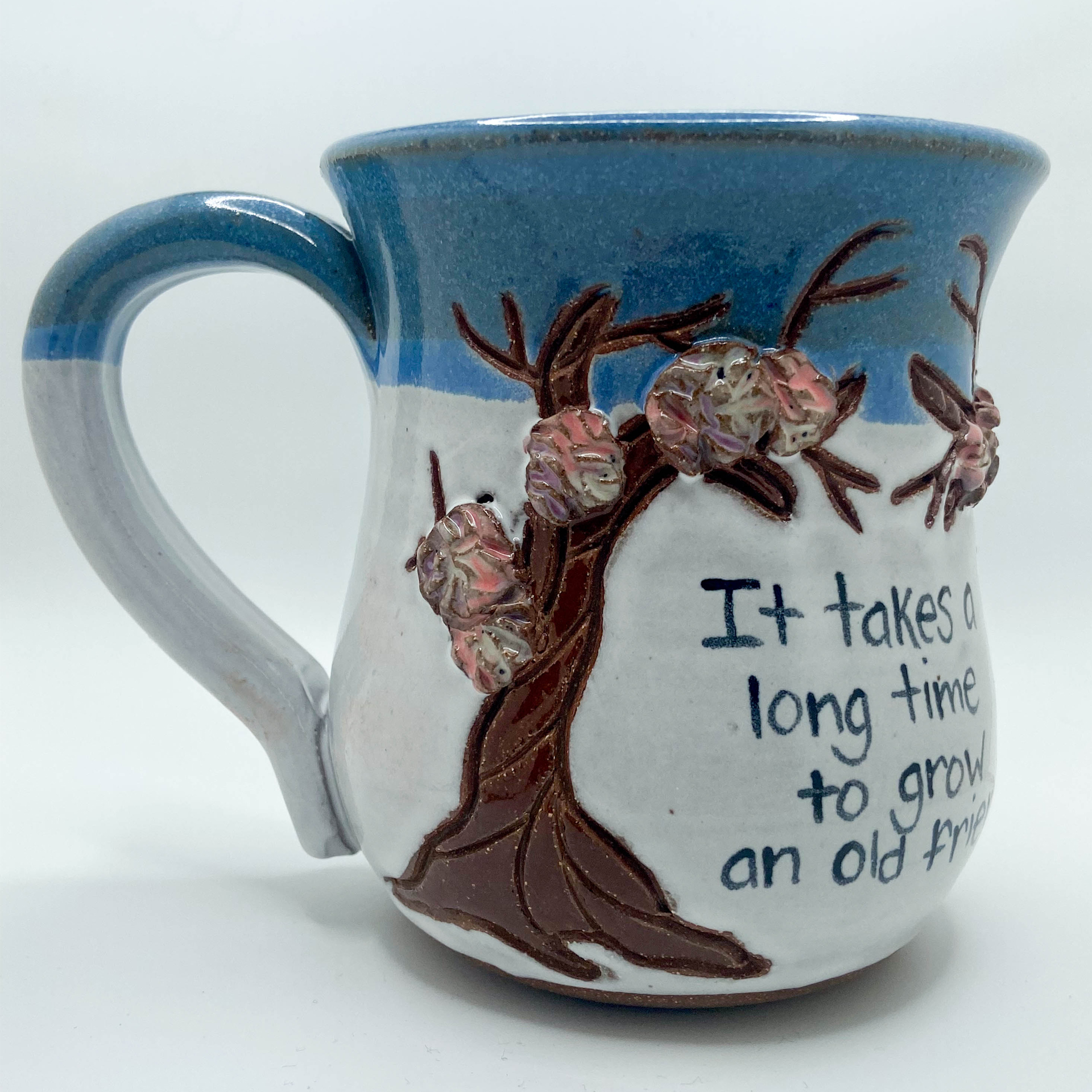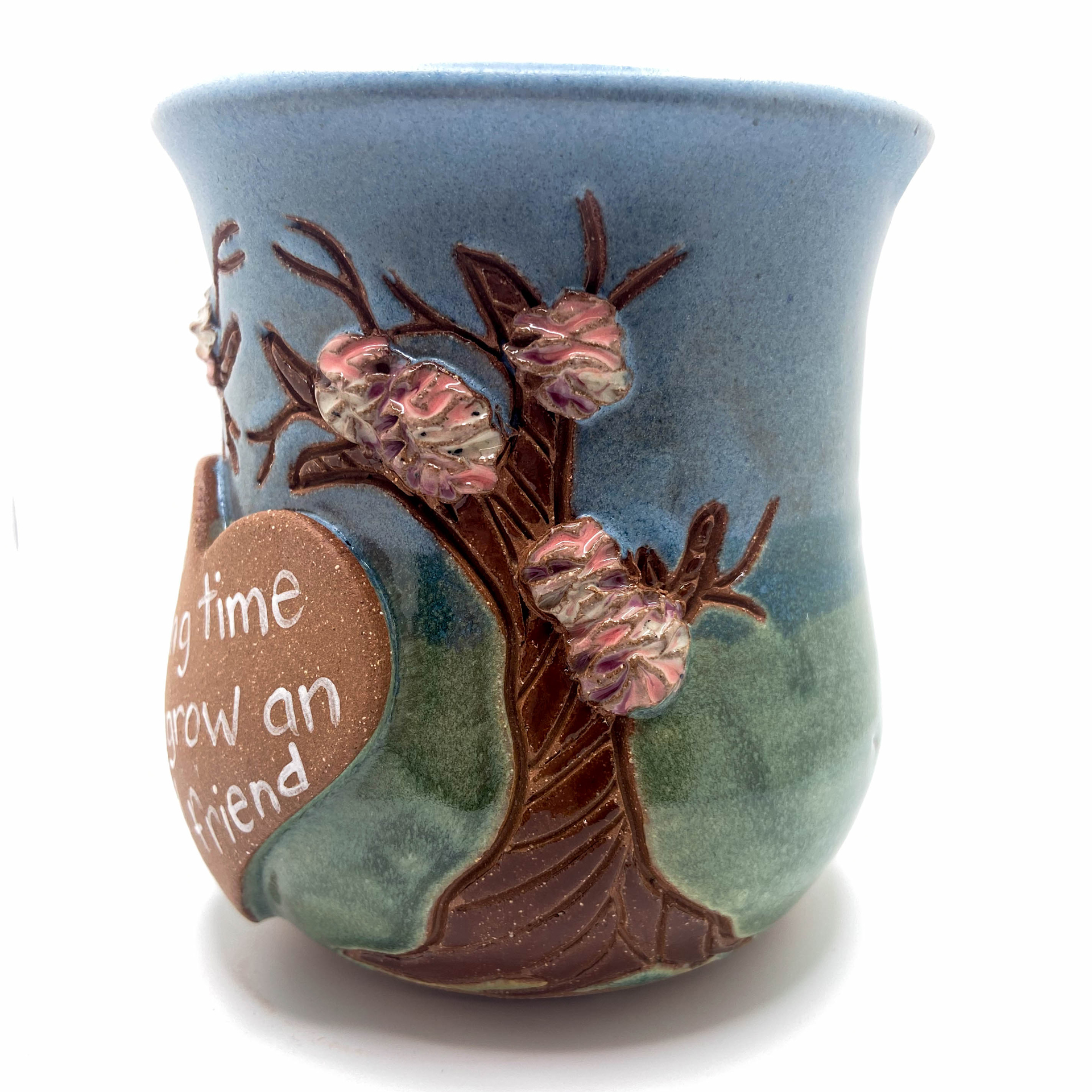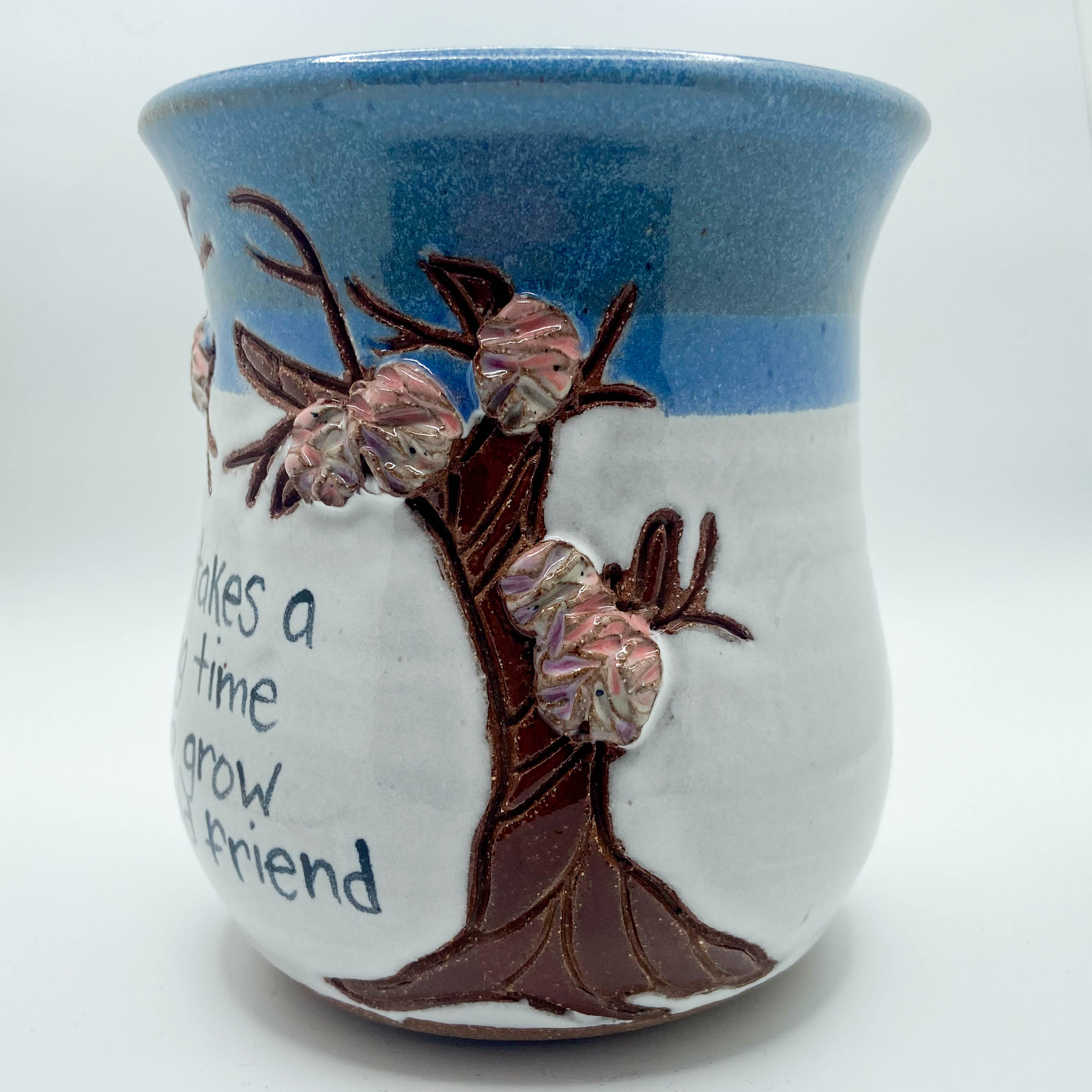 Different sayings of friendship and trees, Stoneware on Spring glaze combination. 14-16 oz.