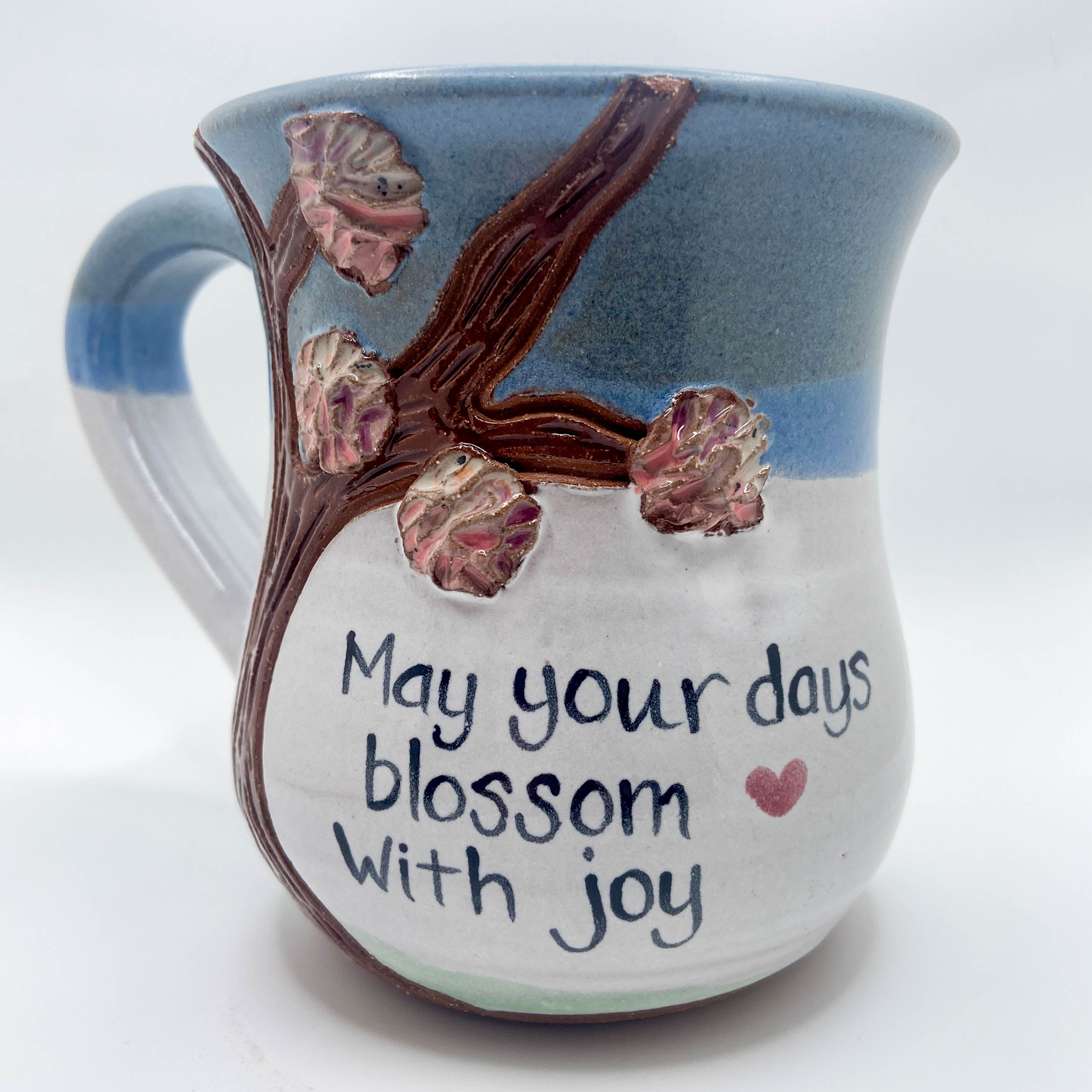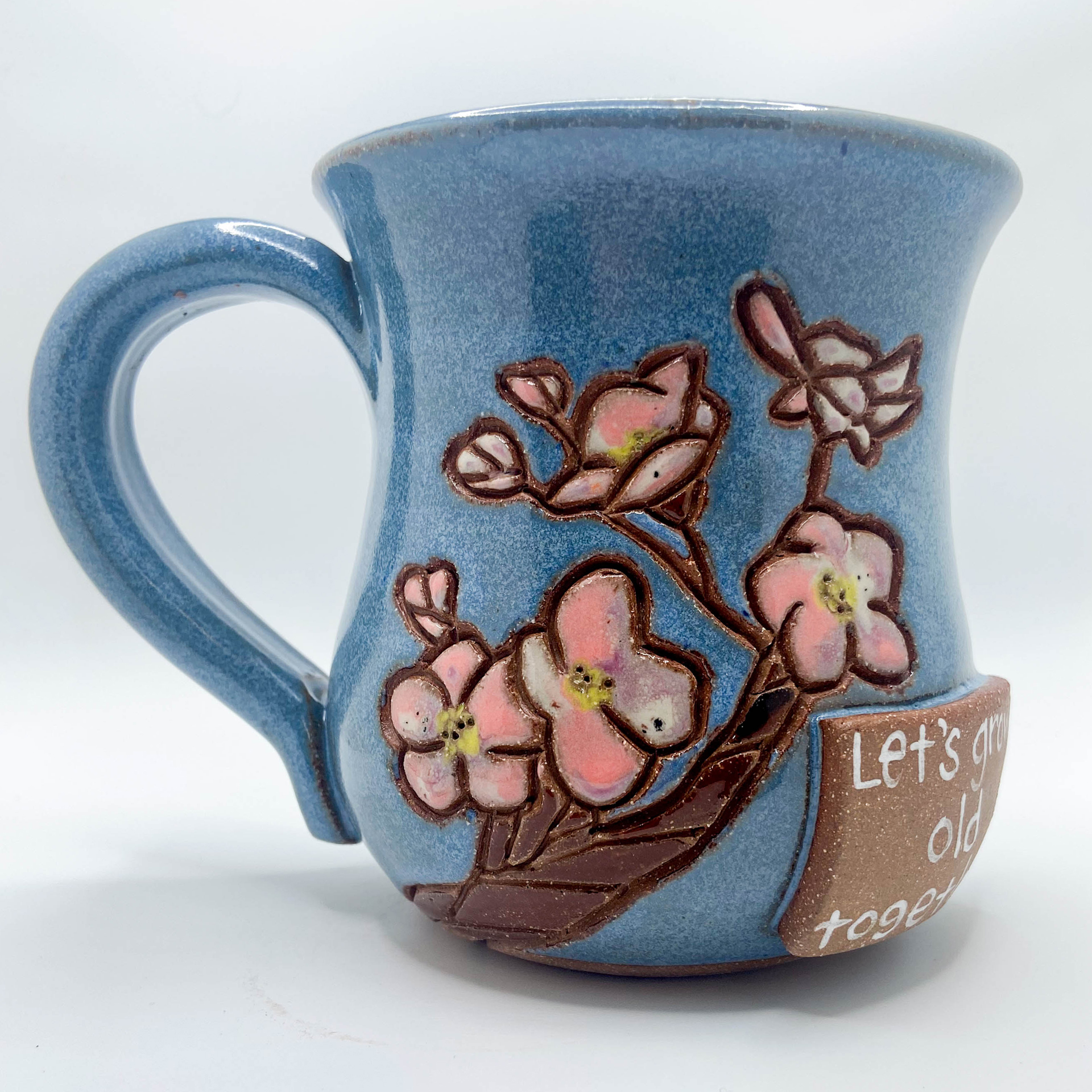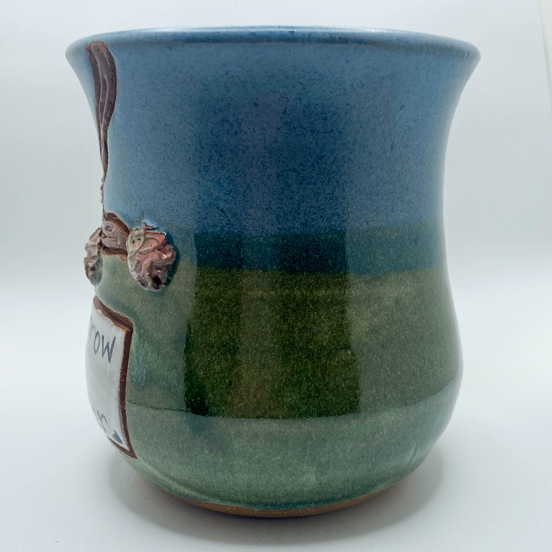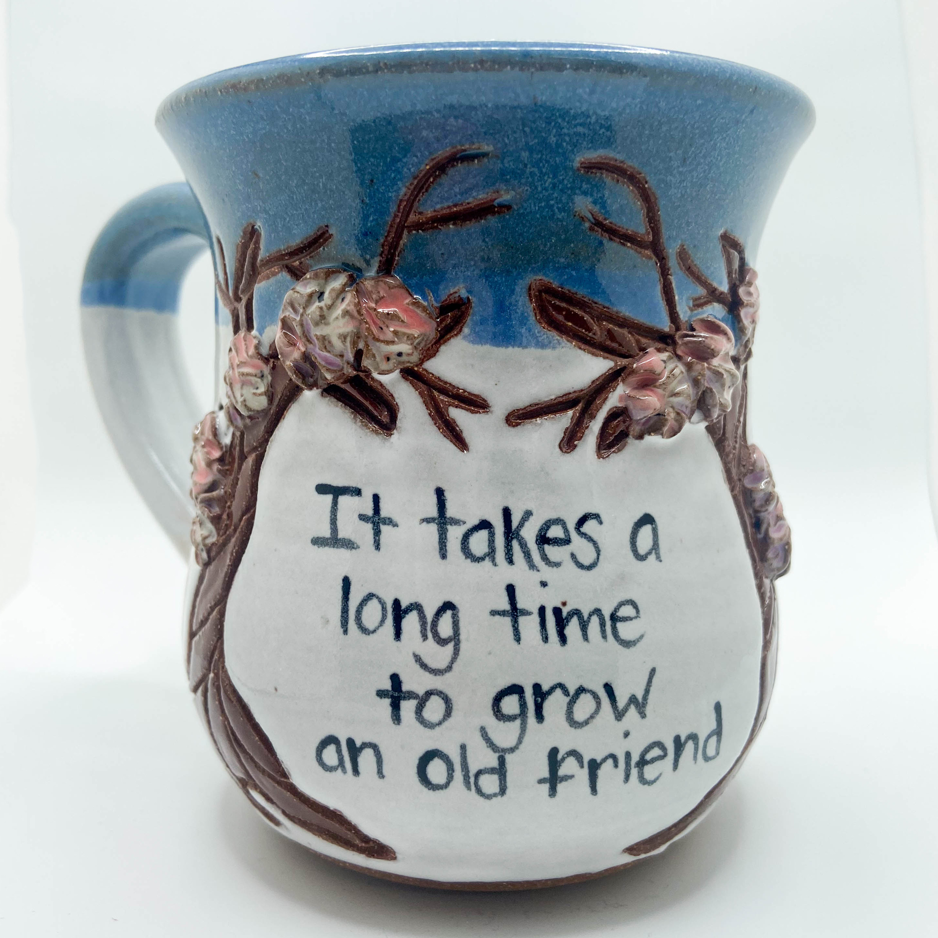 Different sayings of friendship and trees, Stoneware on Spring glaze combination. 14-16 oz.