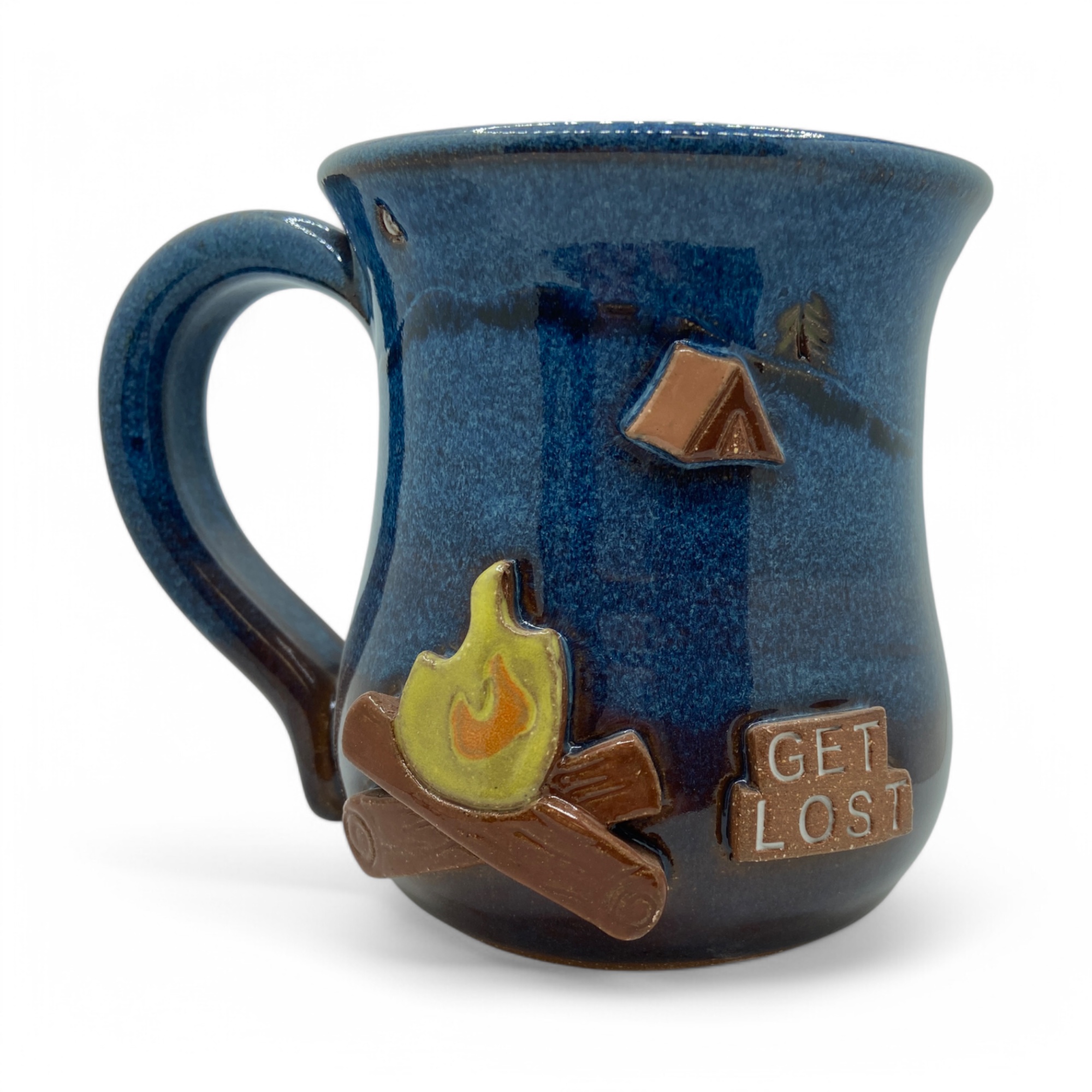 Campfire with tent, tree and moon in the background with “get lost” lettering plaque, Stoneware on Floating blue and Mauve glaze. 14-16 oz.