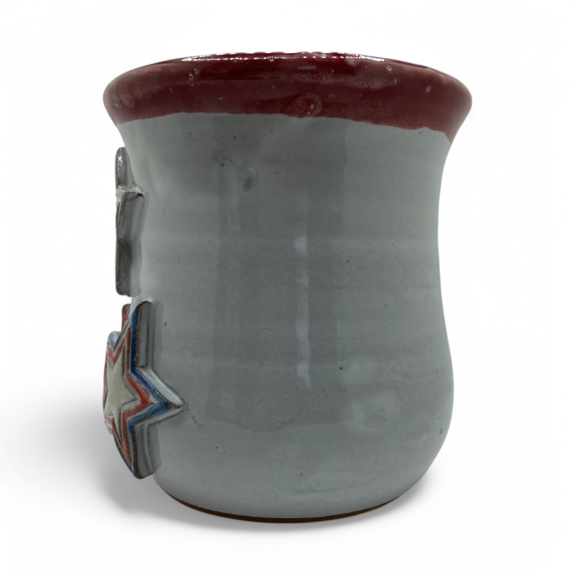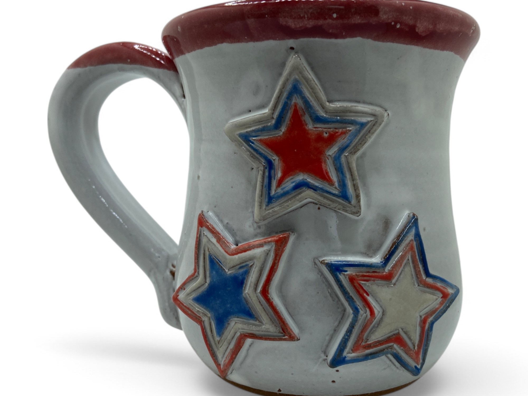 Show your patriotic pride with our handmade ceramic star-spangled mug—a stunning tribute to the American spirit! Crafted with care by skilled artisans, this sturdy mug boasts a classic white glaze, accented with tactile 3D stars in vibrant red, white, and blue—echoing the stars and stripes of the flag—plus a bold red rim and handle for a pop of color. Perfect for your morning coffee, Independence Day toast, or everyday sip, its ergonomic handle and generous size make it ideal for patriots, collectors, or anyone who loves handmade charm. Whether you’re gifting it for a holiday, honoring your love for country, or treating yourself, this unique mug brings a touch of starry brilliance to your daily routine.