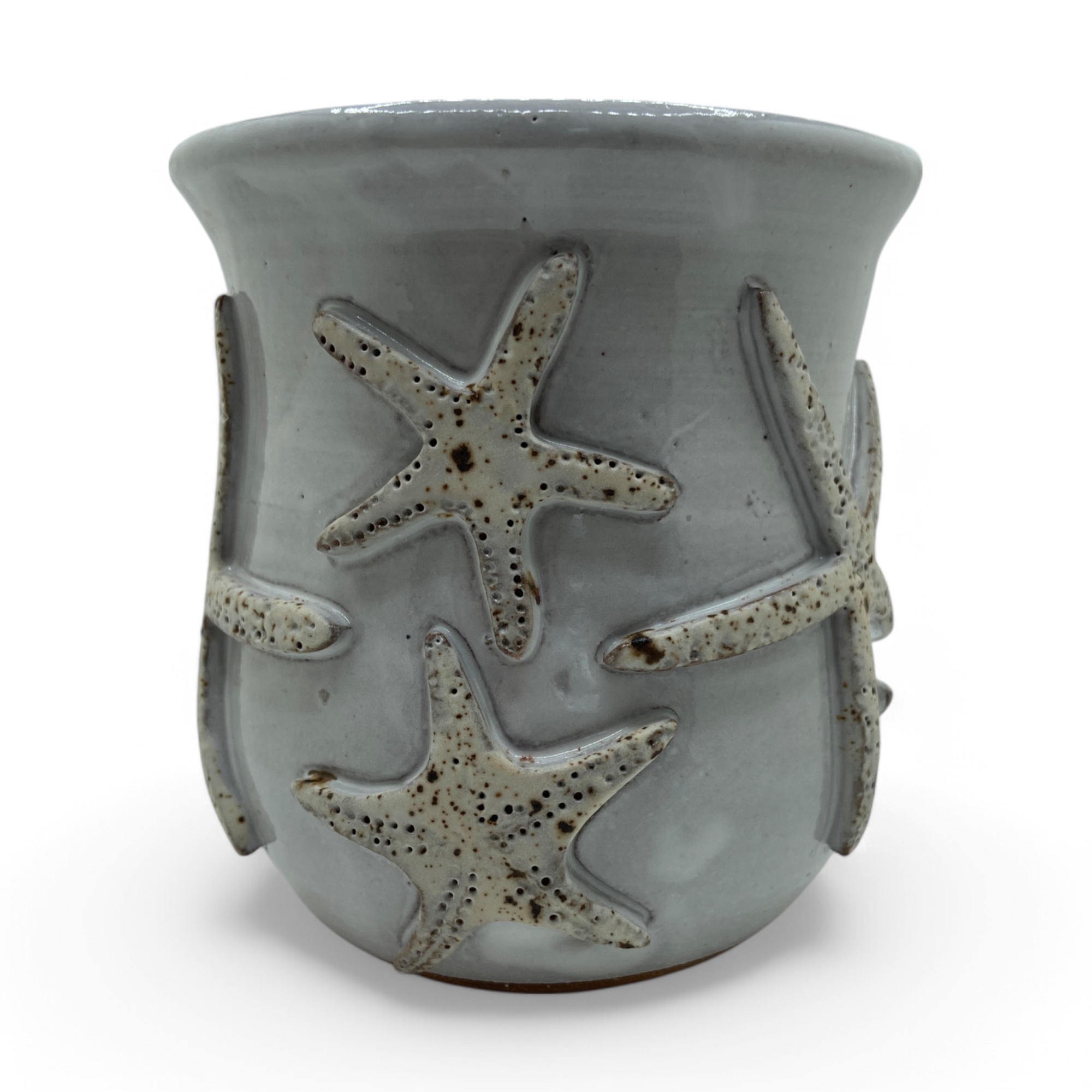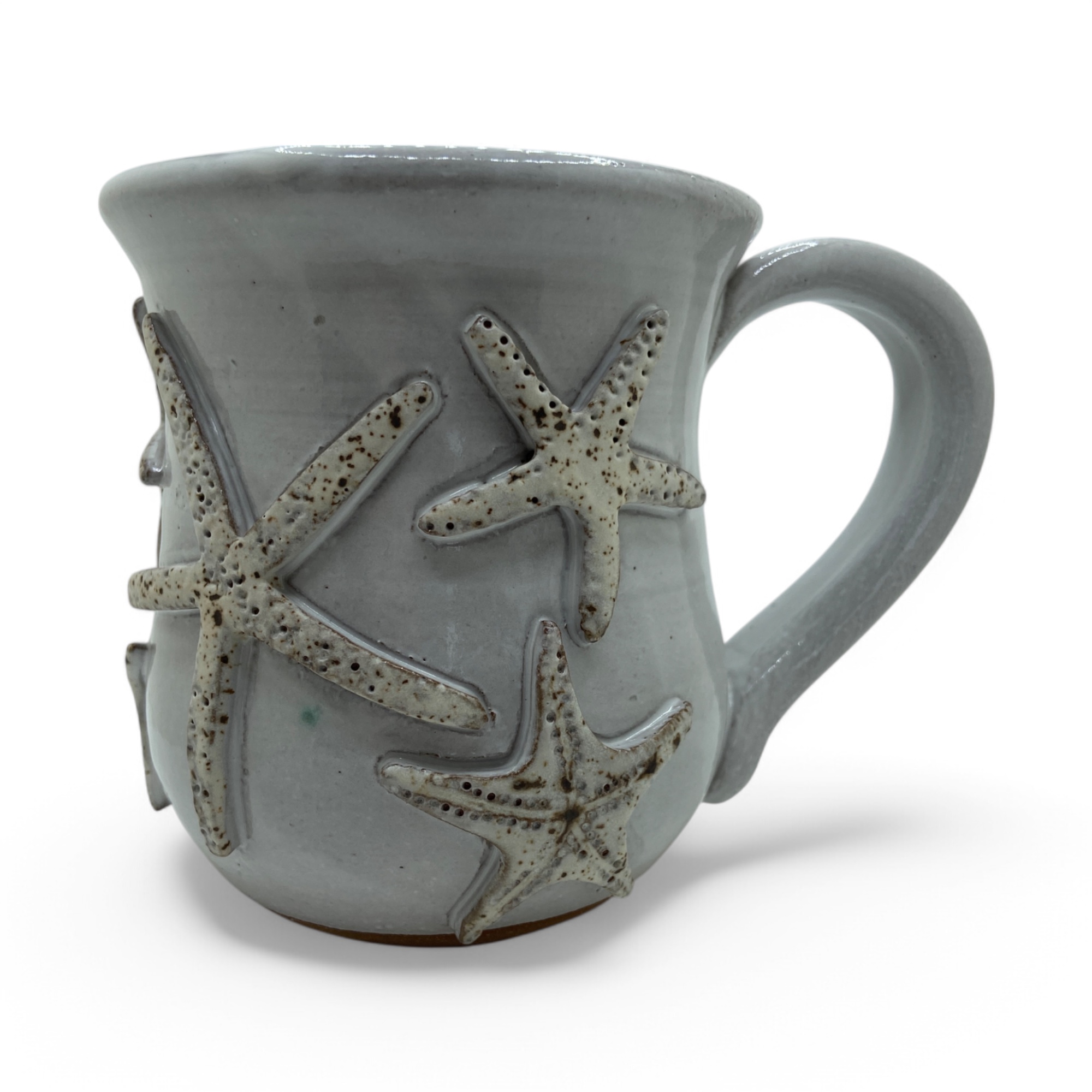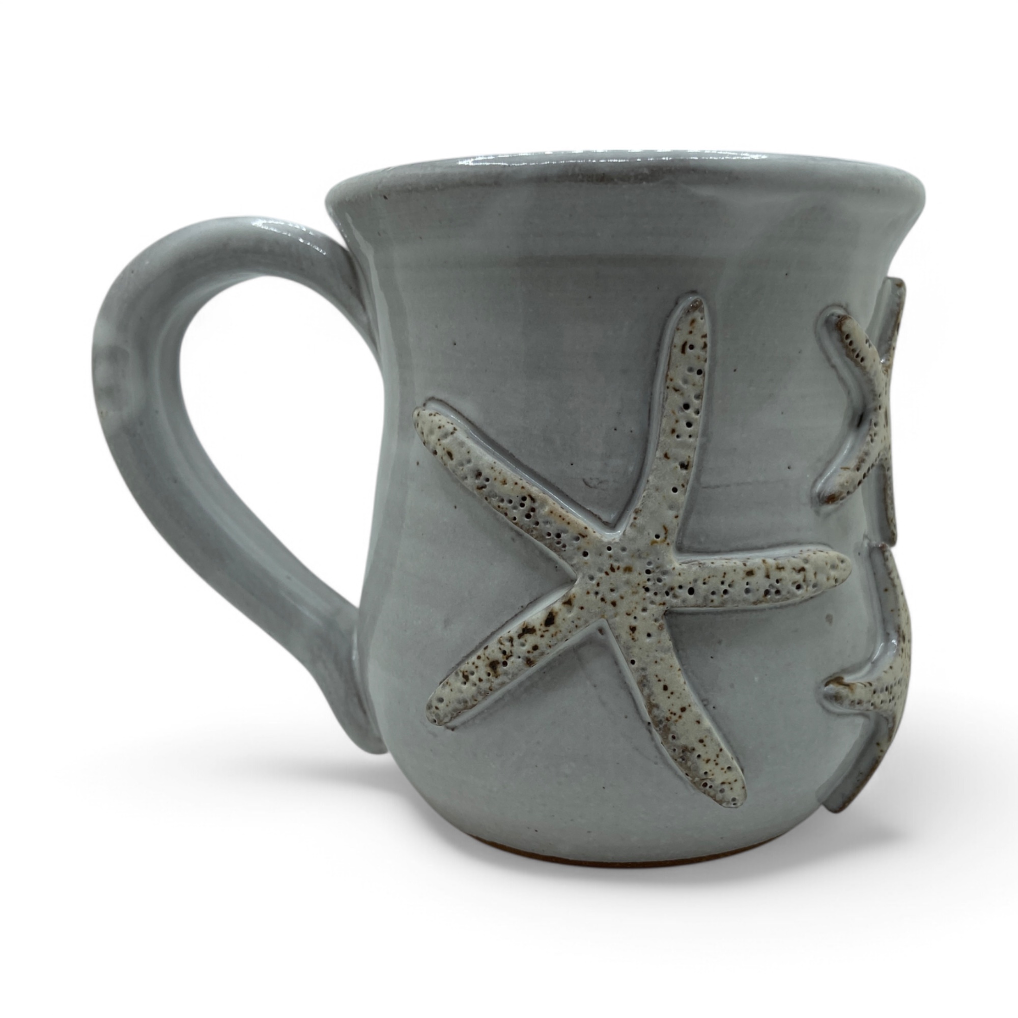 Starfish seashells around entire mug, Stoneware on white glaze. 14-16 oz.