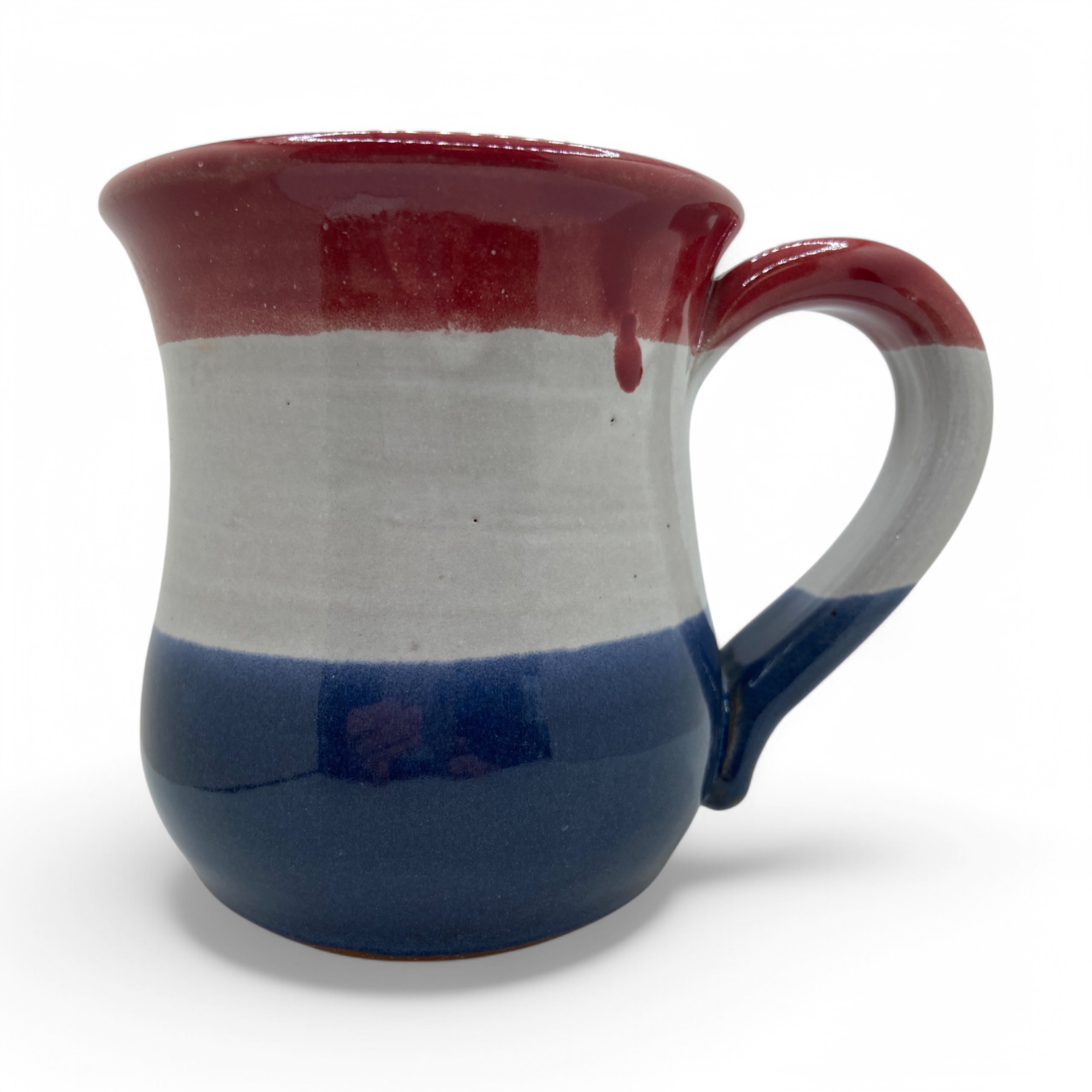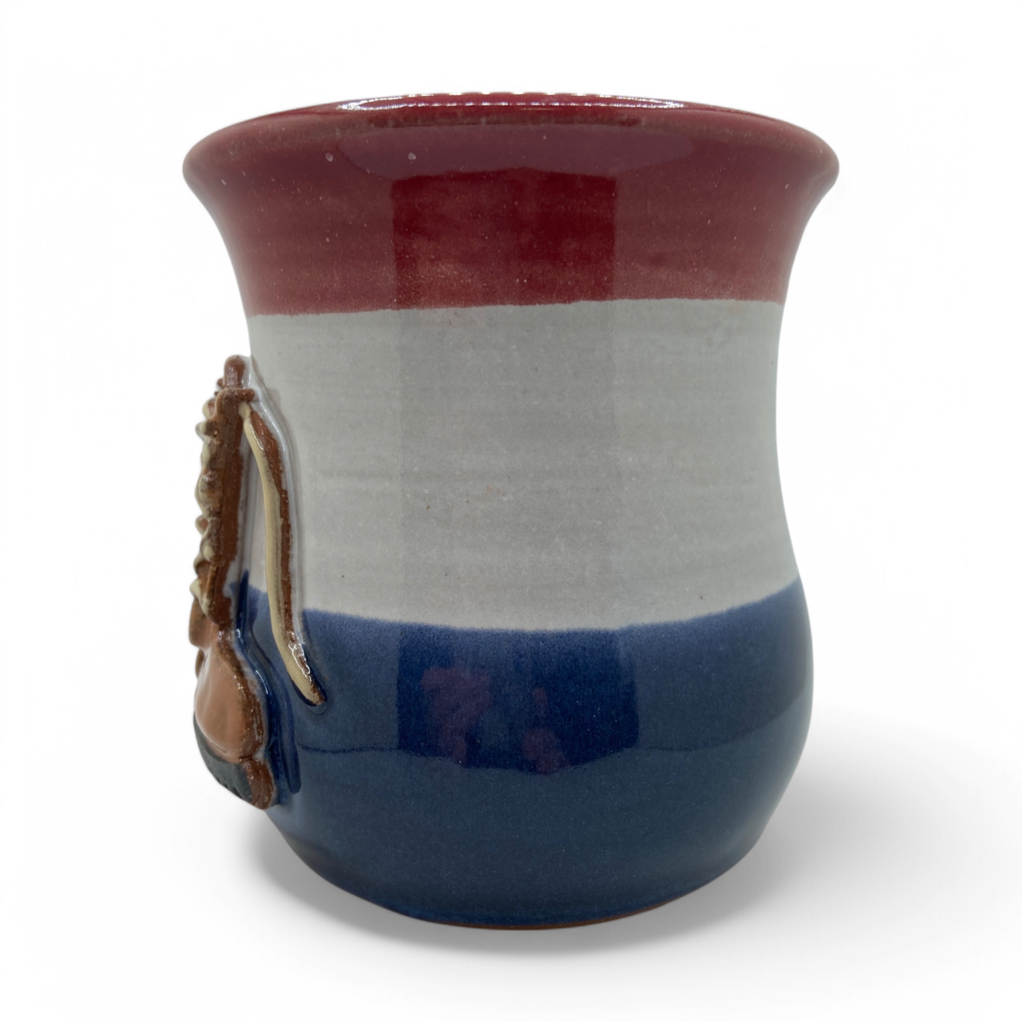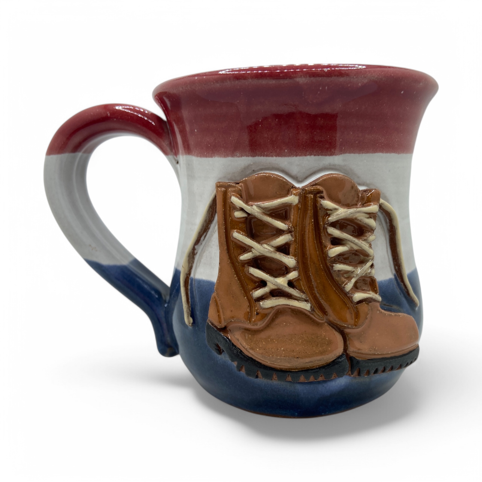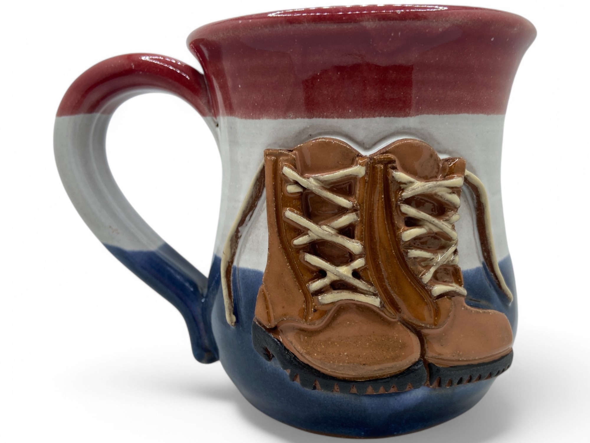 Work boots on red white and blue background, Stoneware on white glaze with red and blue. 14-16 oz.