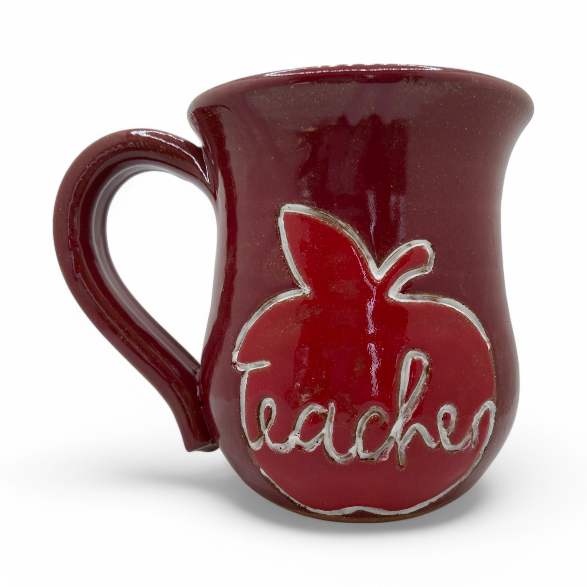 A carved apple that spells out Teacher, Stoneware on our new red glaze. 14-16 oz.