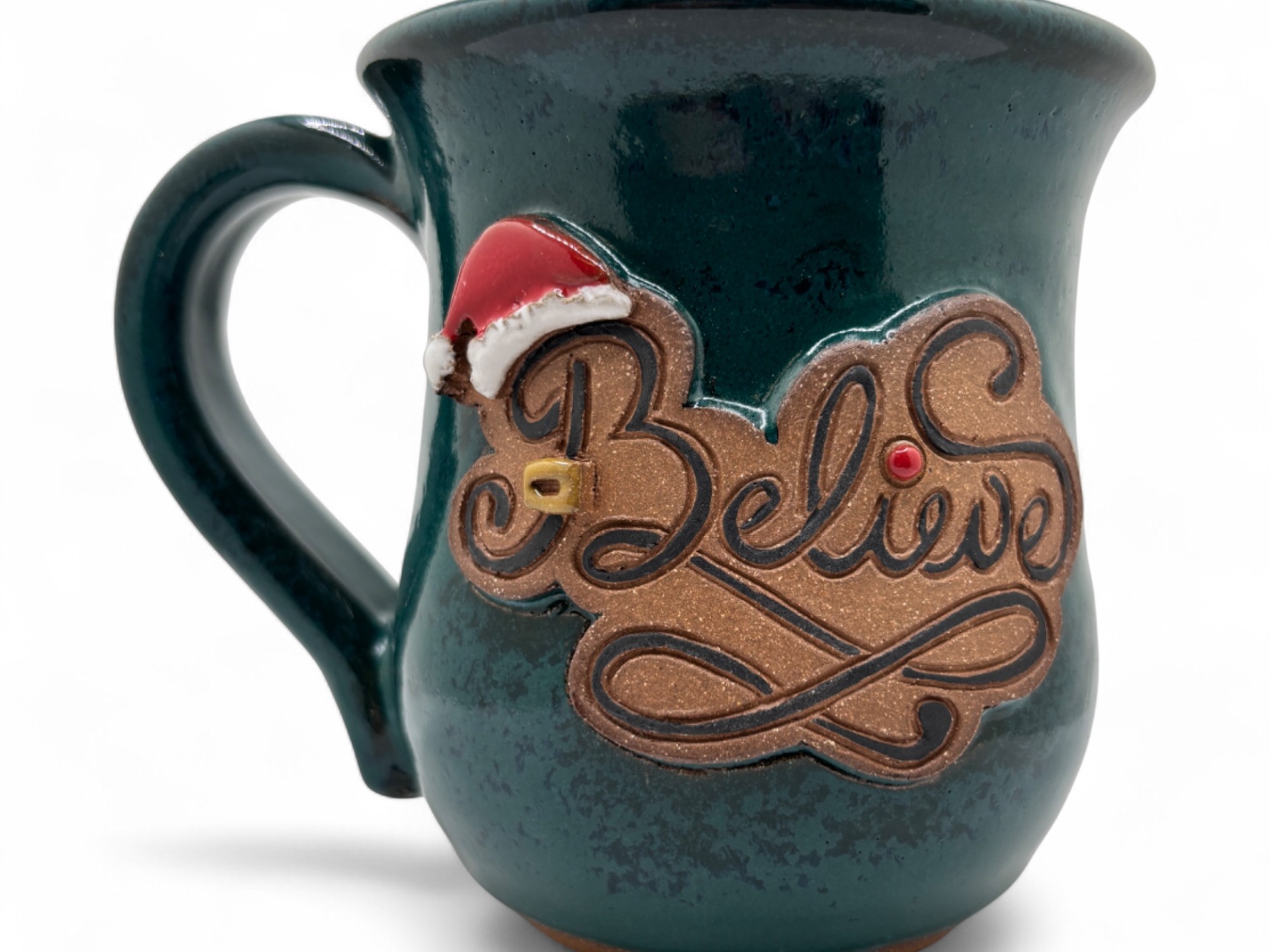 Sip the magic of Christmas with our hand-drawn “Believe” mug, featuring a Santa hat, buckle, and Rudolph’s glowing nose on a festive plaque! Glazed in a stunning emerald green, this 14-16 oz handmade beauty is your holiday must-have—perfect for cozy drinks and spreading cheer. Snag yours before Rudolph flies off!