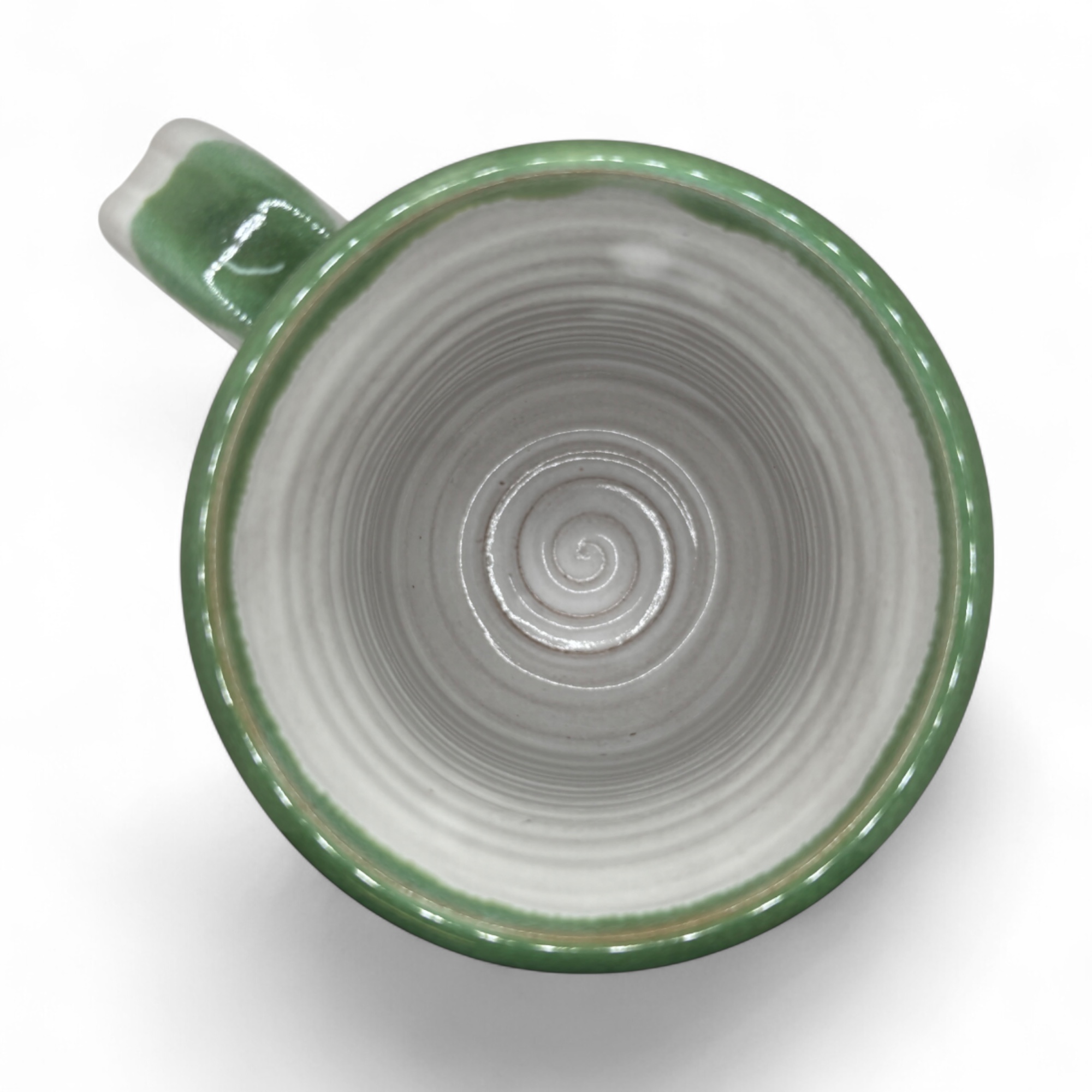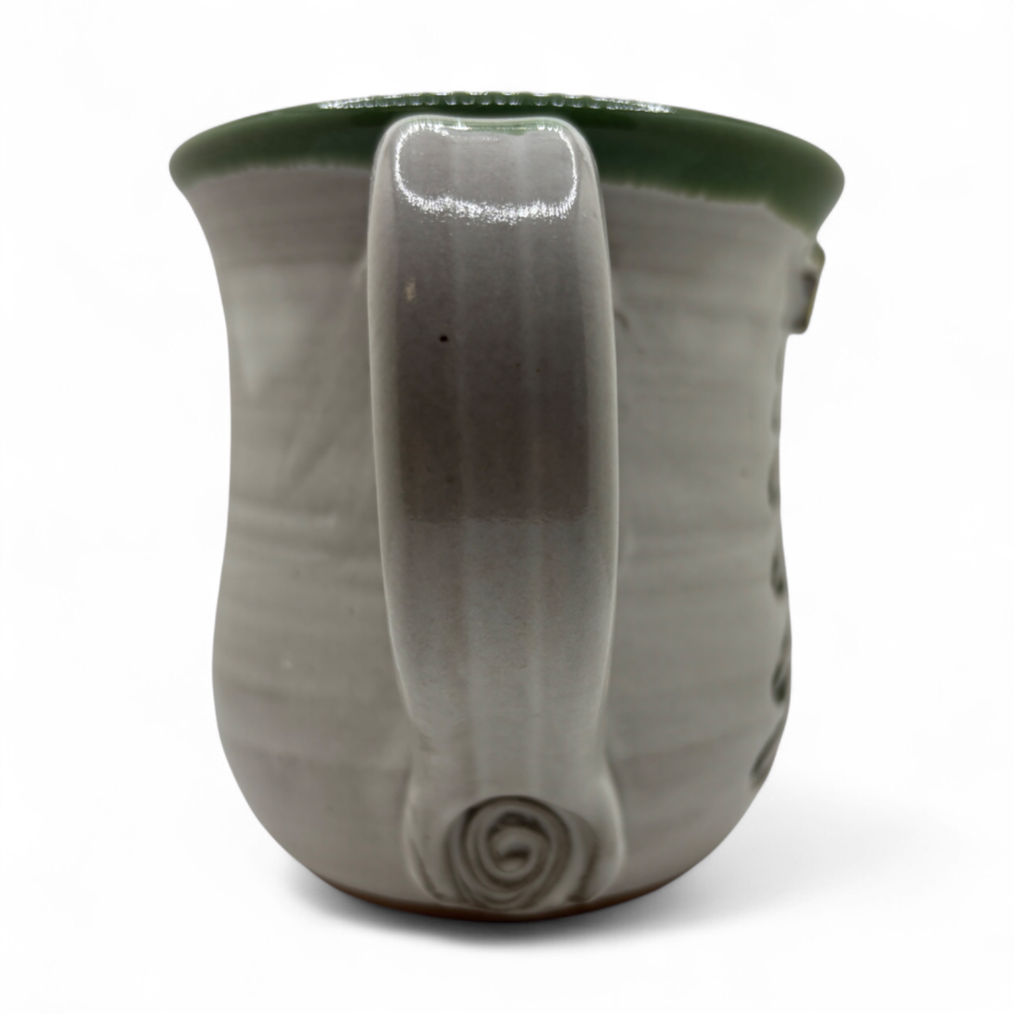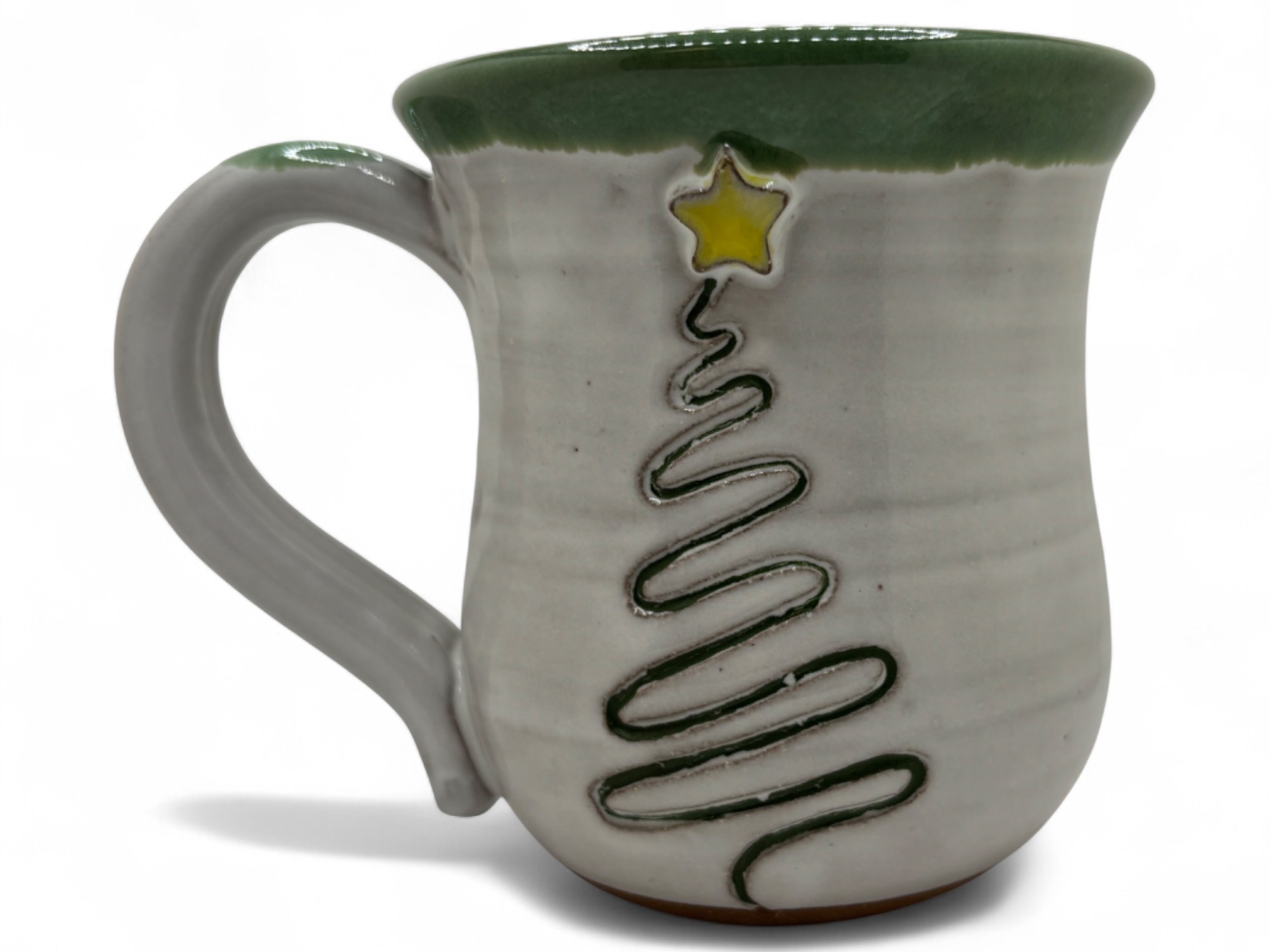 Add a touch of whimsy to your sips with our handmade mug, featuring a carved swirly tree topped with a glowing star! Dunked in our beautiful white glaze with a festive green rim, this 14-16 oz gem is perfect for cozy coffees or teas—bringing handmade charm and holiday magic to every pour. Snag yours now!