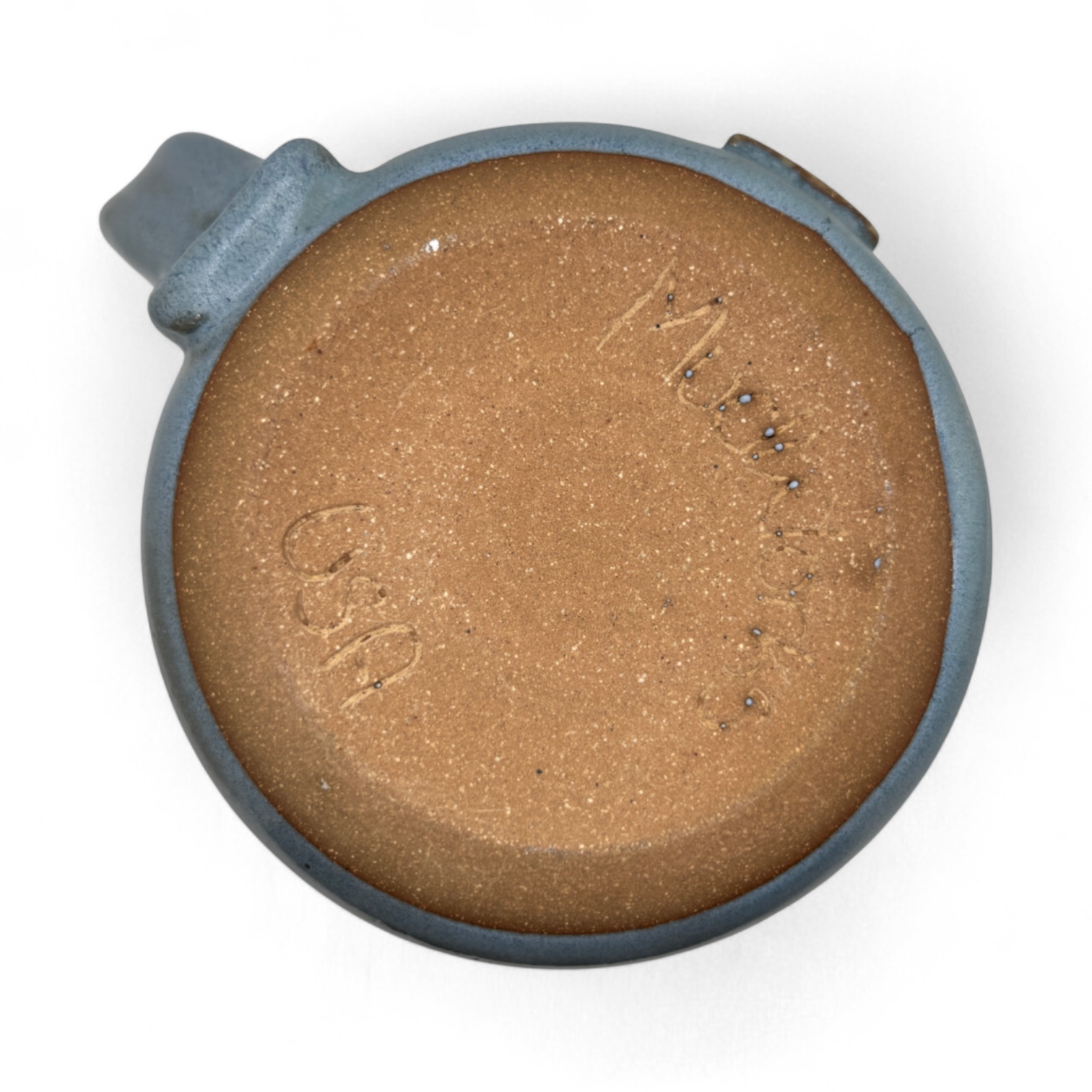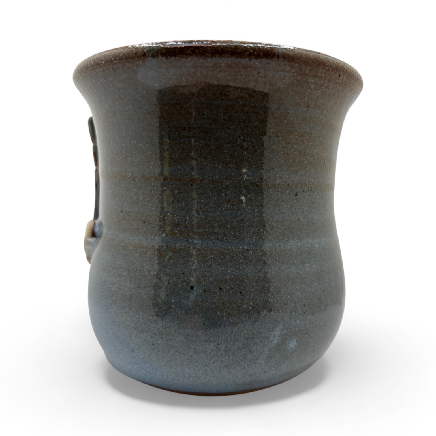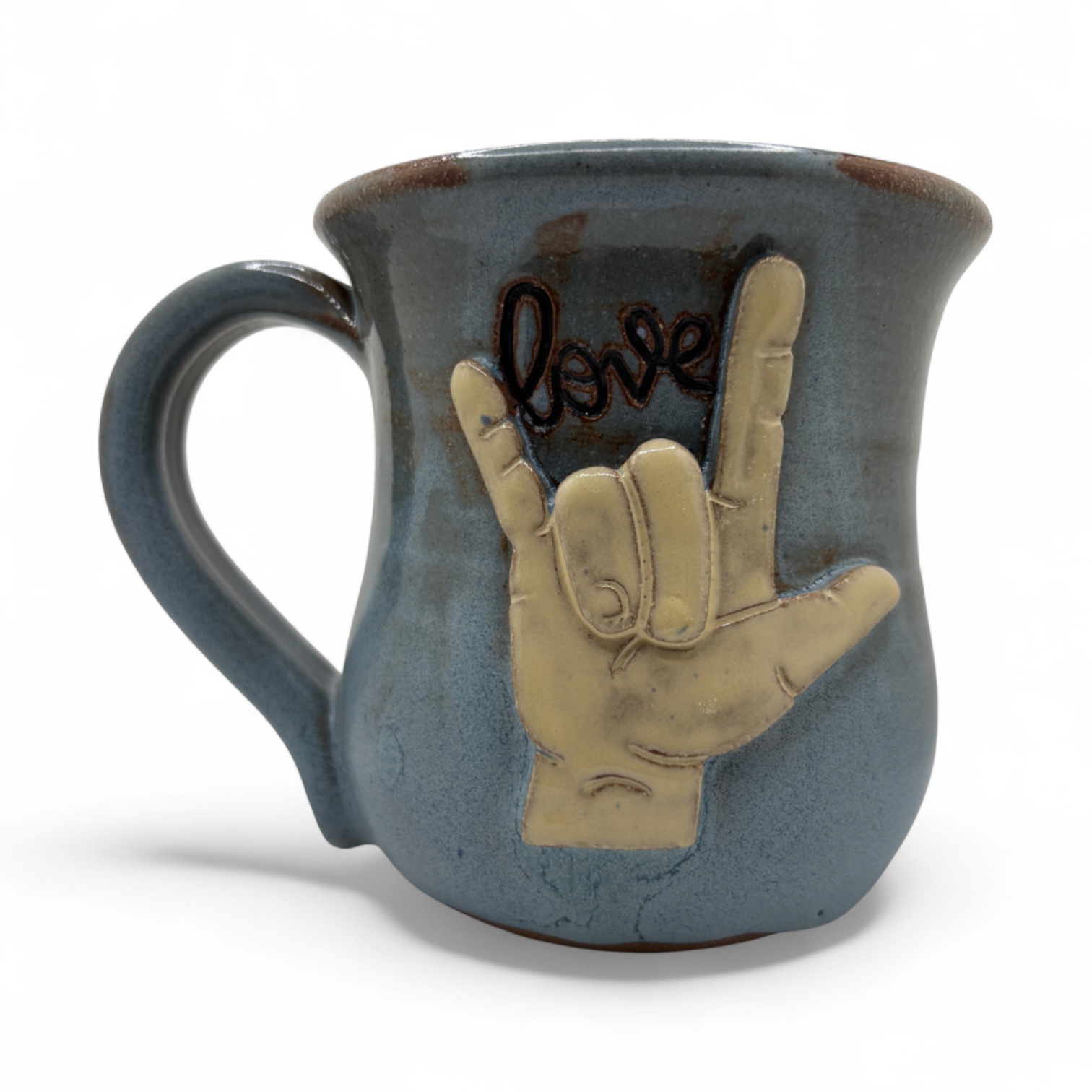 A sign language symbol for I love you with the word love carved above, Stoneware. 14-16 oz.