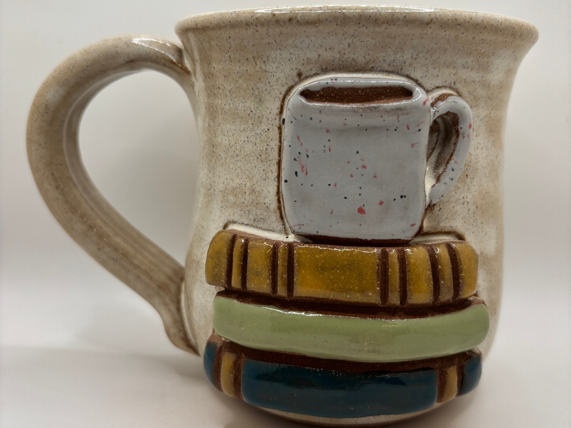 A stack of books with amug on top on a sandstone mug, Stoneware. 16-18 oz.