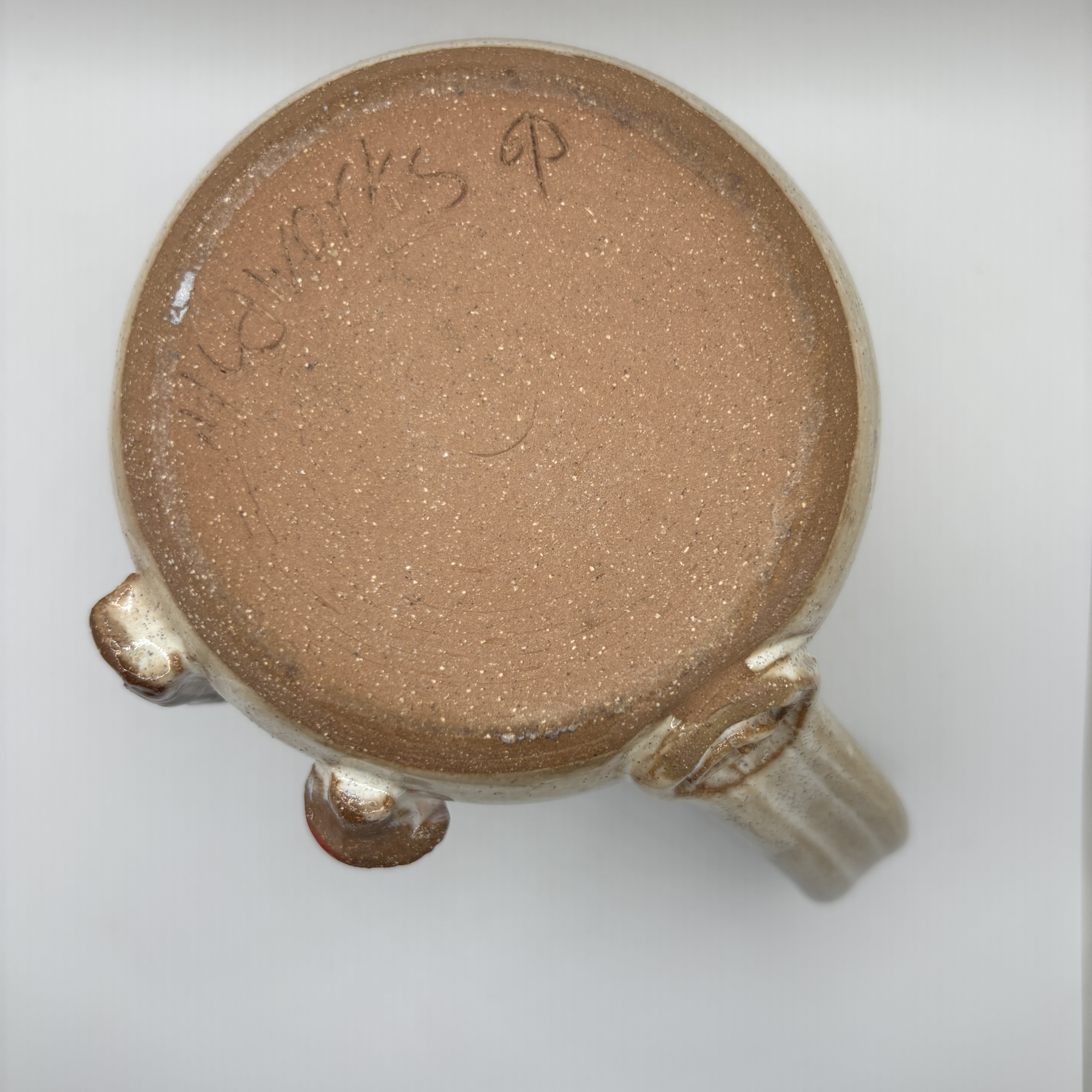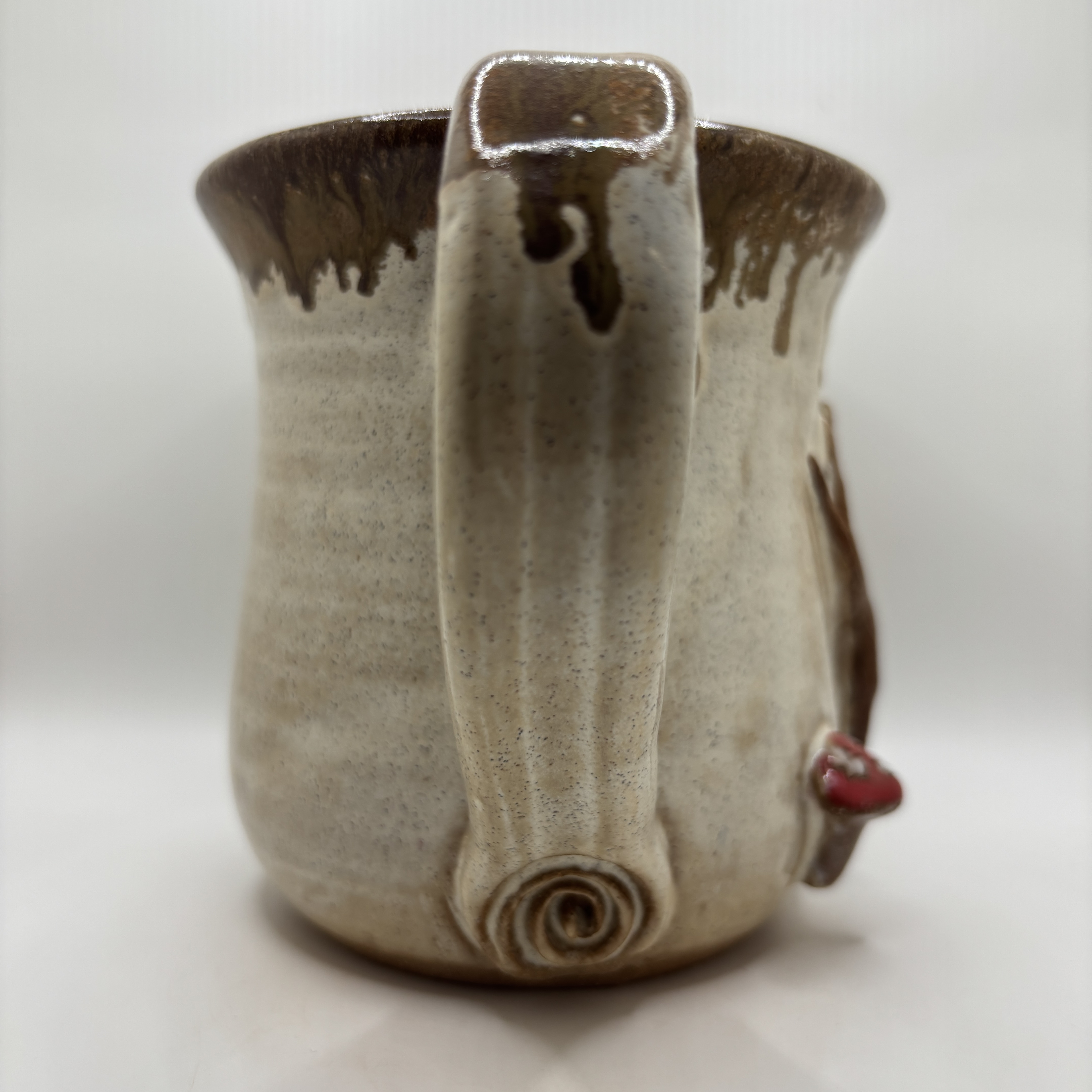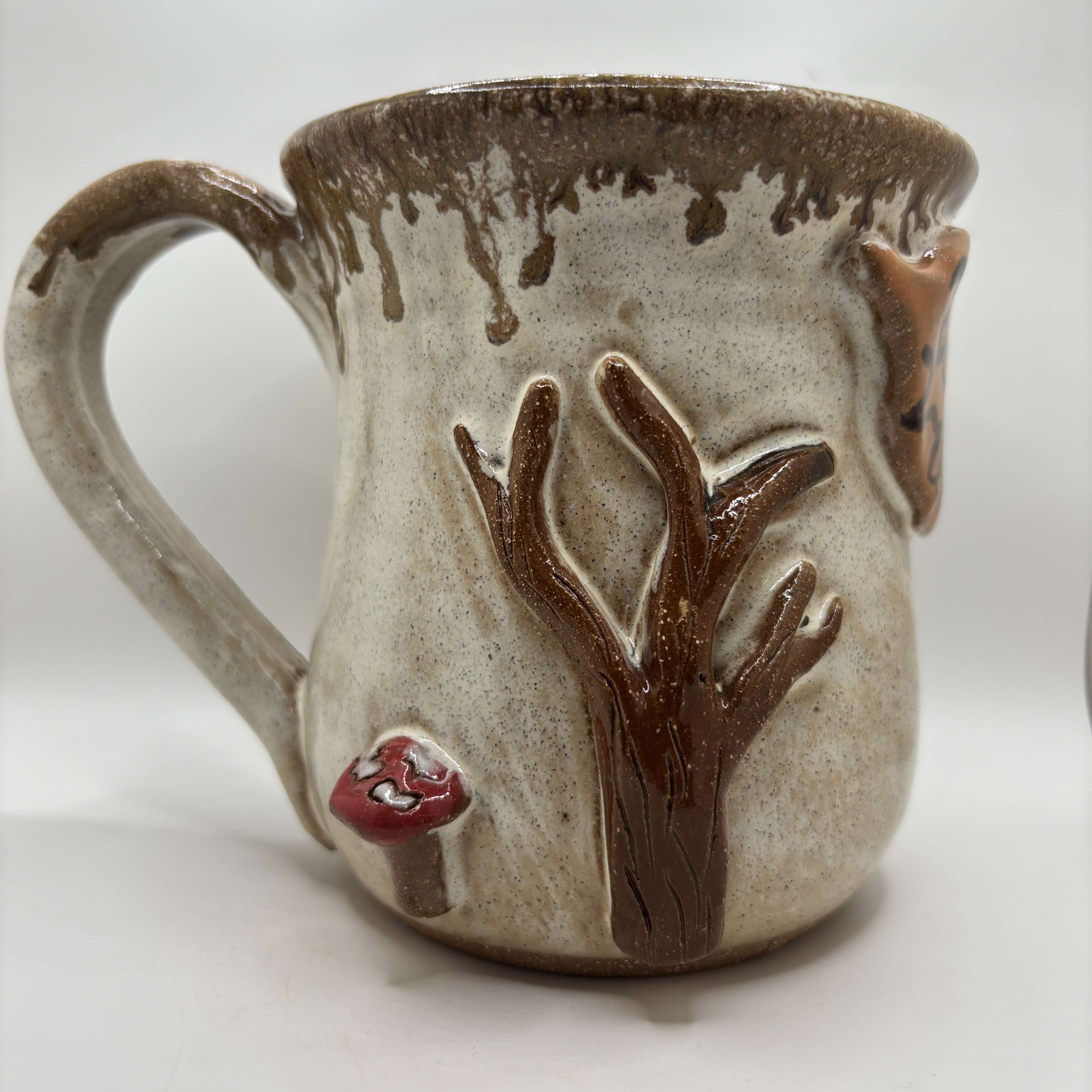 A tree, mushroom, and a fall leaf on a sandstone mug topped with randys red, Stoneware. 16-18 oz.