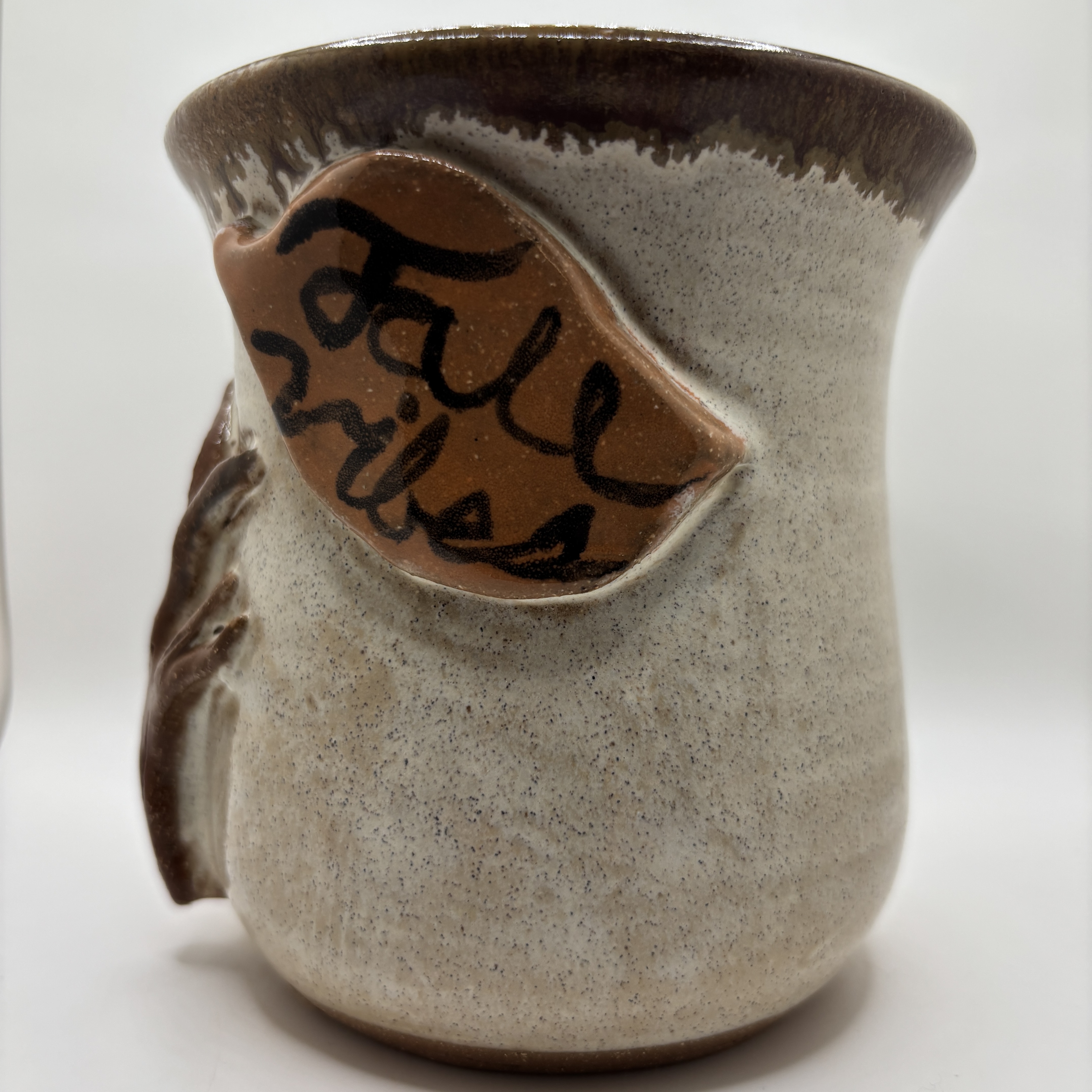 Fall in a mug—literally. This cozy stoneware mug is hand-carved with a whimsical autumn scene: a graceful tree bursting with fall colors, a tiny adorable mushroom peeking out beside it, and one perfect drifting autumn leaf. Right below, the cheerful words “Fall Vibes” are hand-lettered in a playful script that feels like crunchy leaves underfoot. Finished in our signature sandstone glaze—a warm, golden-tan base that glows like late-afternoon sunlight—topped with rich, deep dark brown that beautifully accents the tree trunk, mushroom cap, and rim. The perfect earthy palette to capture every bit of that crisp, cozy fall feeling.Whether you’re sipping pumpkin spice, hot apple cider, or your favorite tea on a chilly morning, this mug wraps your hands (and your heart) in autumn magic. One-of-a-kind, just like every beautiful fall day. Grab yours before the leaves are gone!