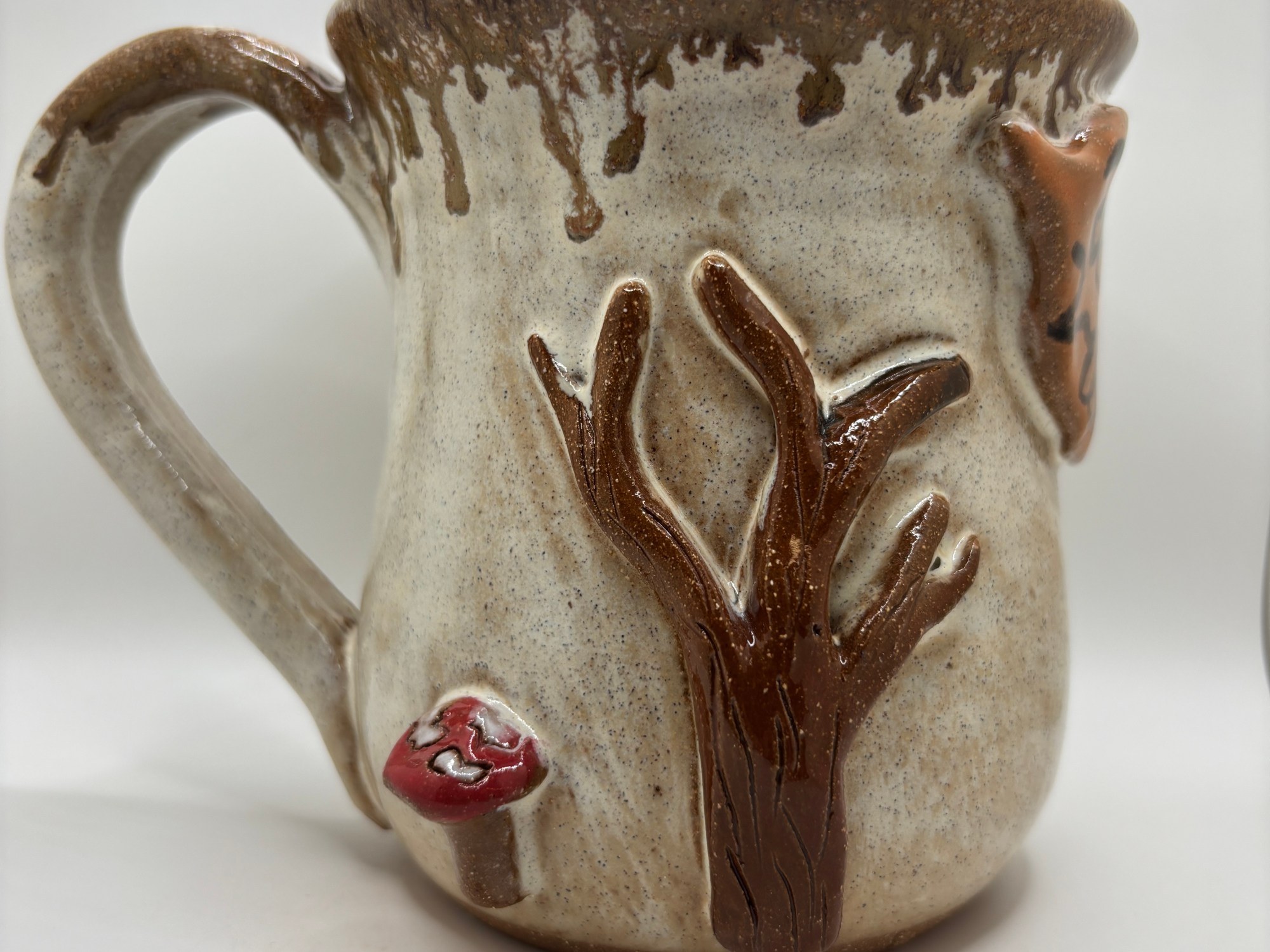 A tree, mushroom, and a fall leaf on a sandstone mug topped with randys red, Stoneware. 16-18 oz.