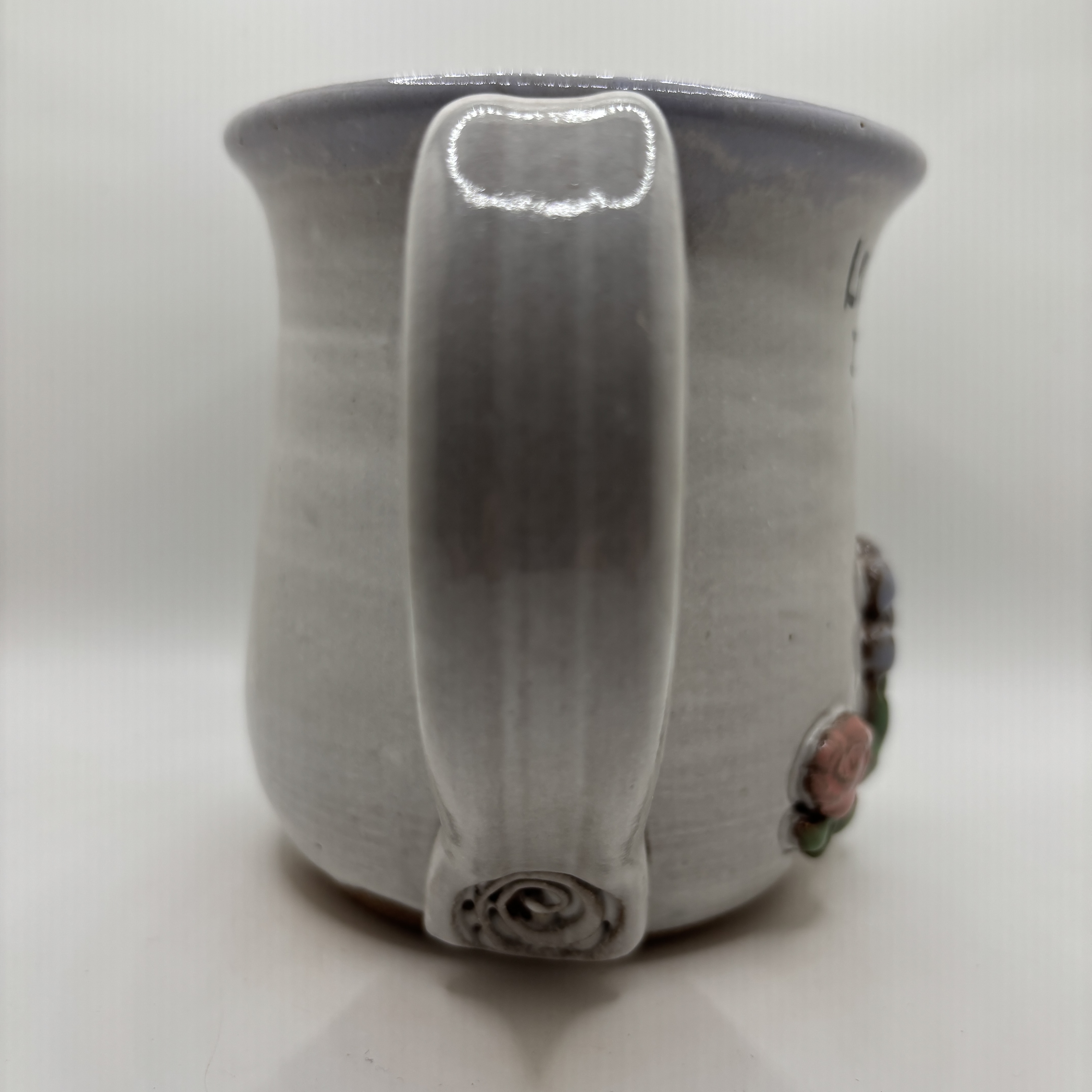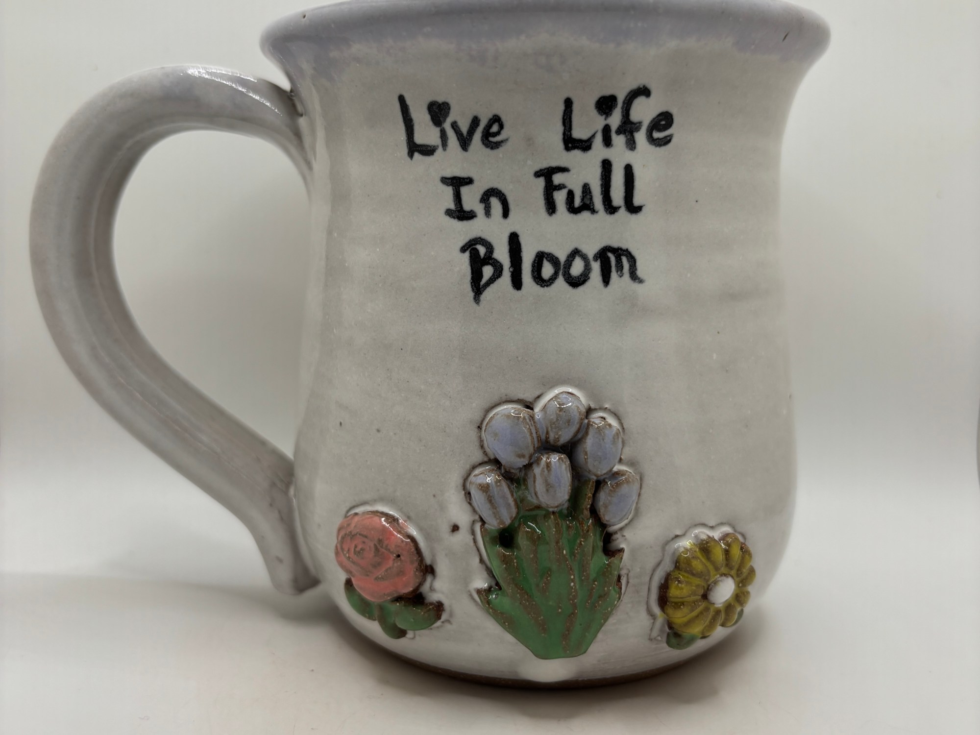 A mug with flowers with the words” Live life in full bloom” on a white mug sponged with purple, Stoneware. 16-18 oz.