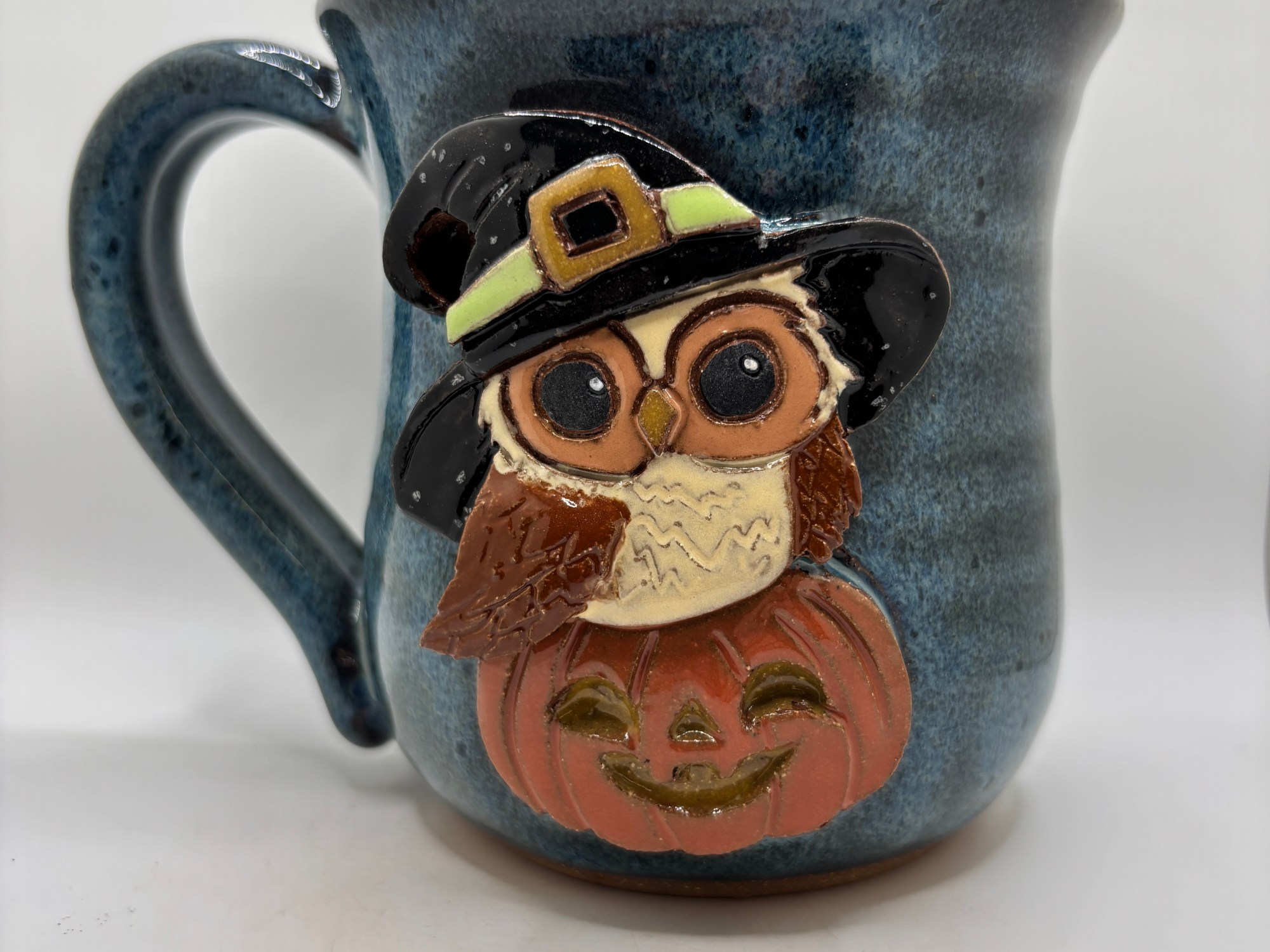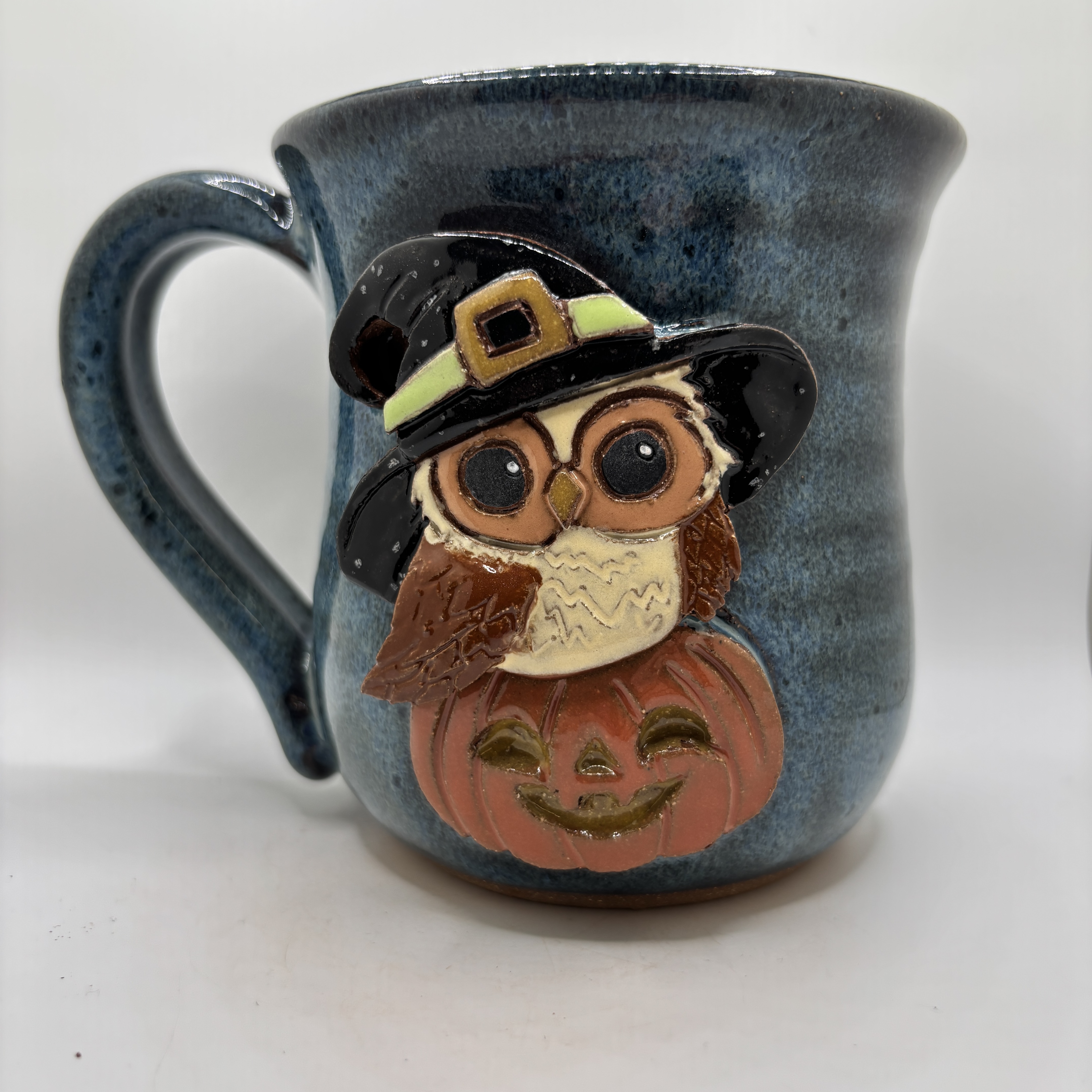 The cutest little witch is ready to cast a spell on your morning routine. This adorable stoneware mug is hand-carved with a sweet little owl all dressed up for Halloween—tiny witch hat perched perfectly on its head, big eyes sparkling with mischief, and it’s sitting right on top of a cheerful jack-o’-lantern with a glowing carved grin. Finished in our floating blue glaze—a soft, dreamy blue with that signature floating effect that gives the whole mug a magical, moonlit Halloween glow from rim to base. Whether you’re sipping coffee before the trick-or-treaters arrive, tea on a crisp October evening, or hot cocoa by the fire, this mug turns every drink into a delightfully spooky-sweet moment. One-of-a-kind and made for owl lovers, Halloween fans, and anyone who loves a touch of whimsy with their witchy vibes. Your new favorite mug is ready to fly into your hands.