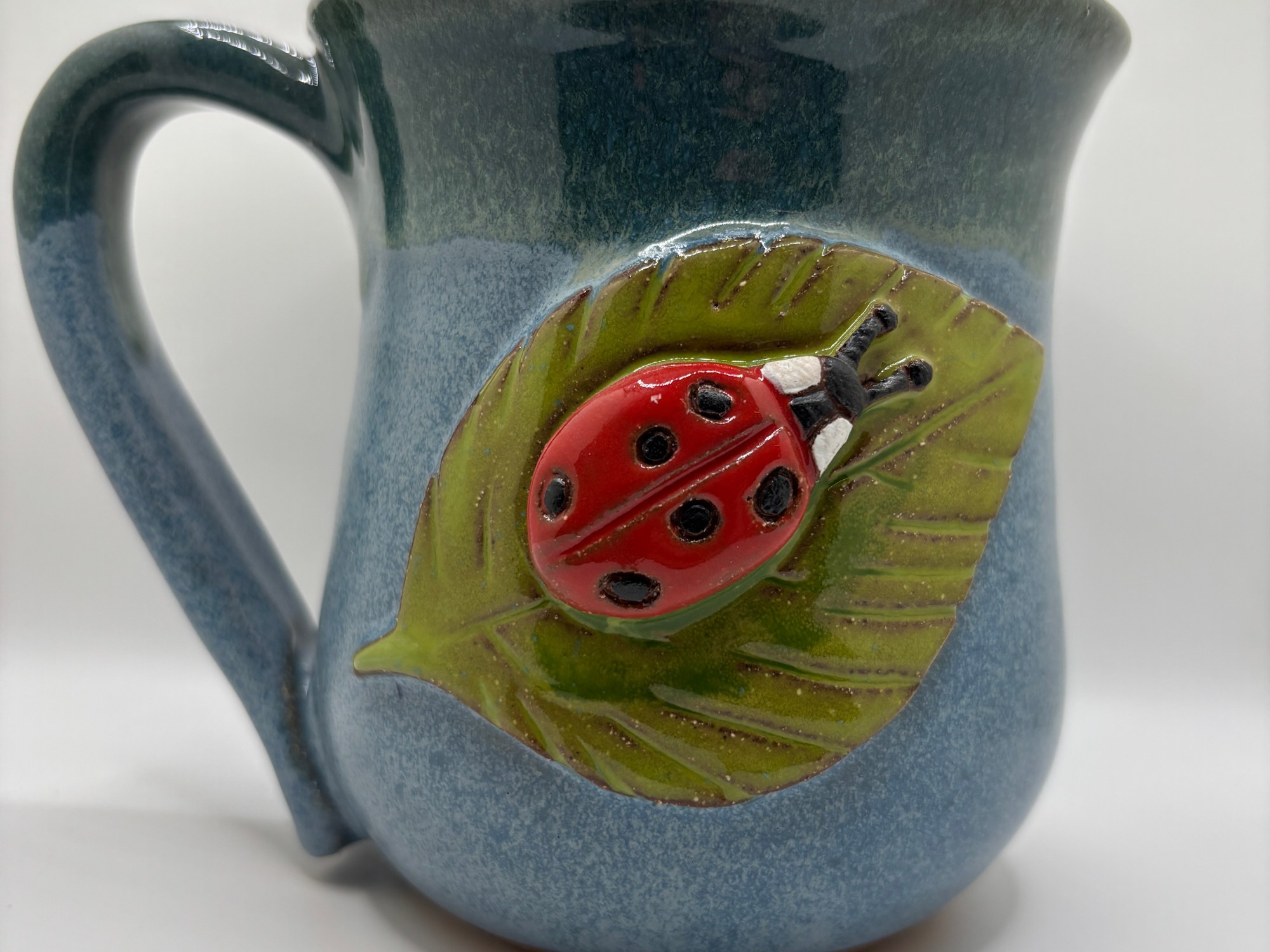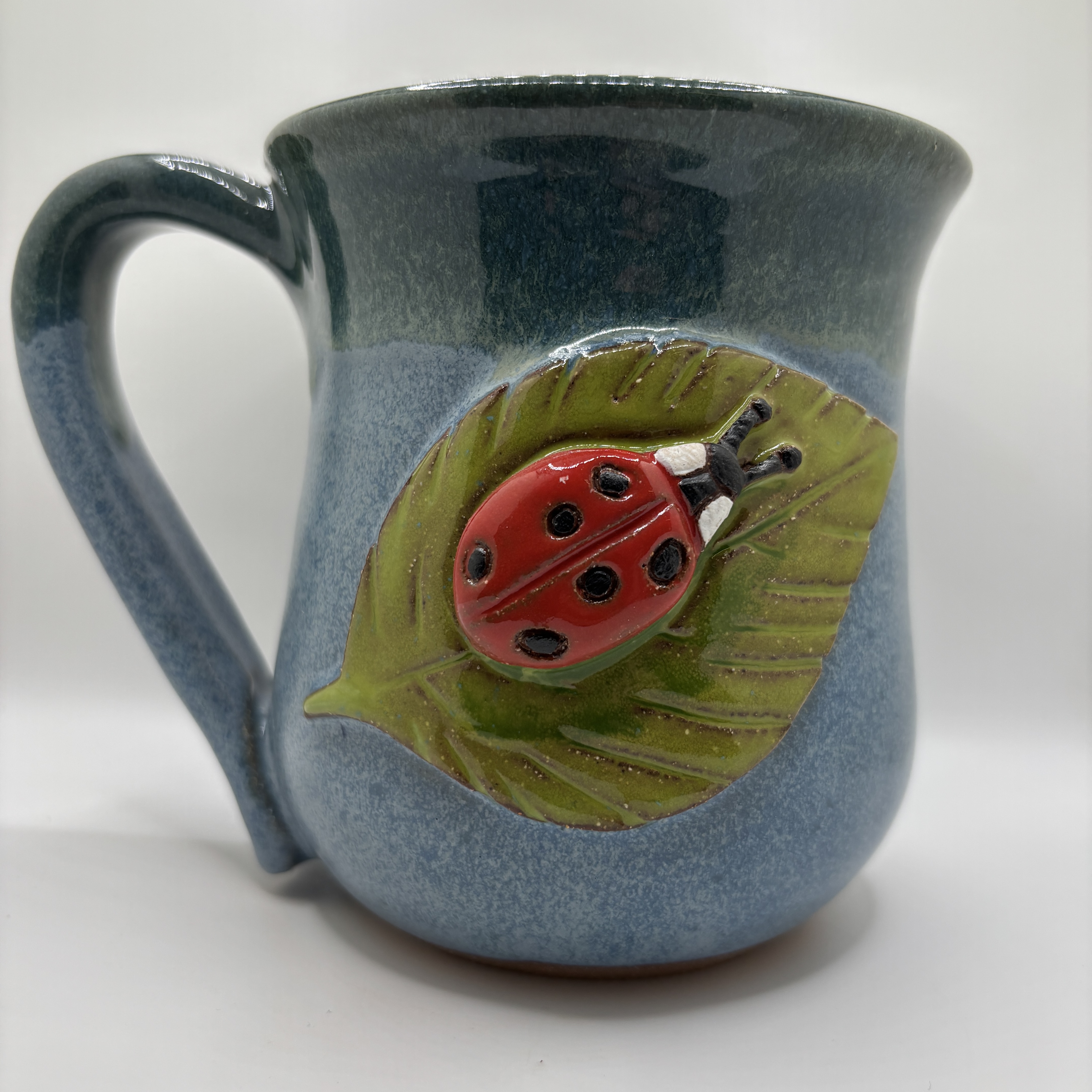 A ladybug on a leaf on a blue mug, Stoneware. 14-16 oz.