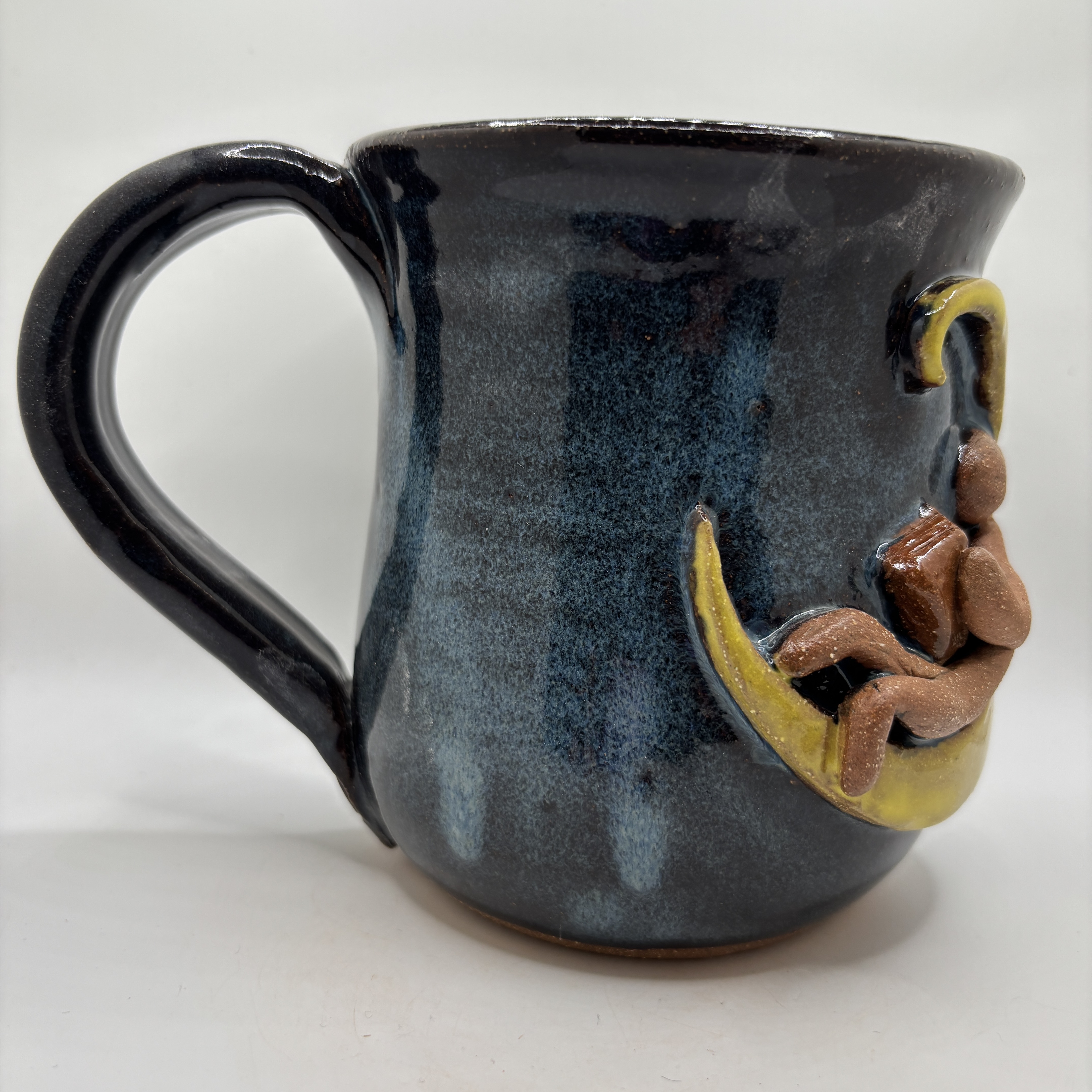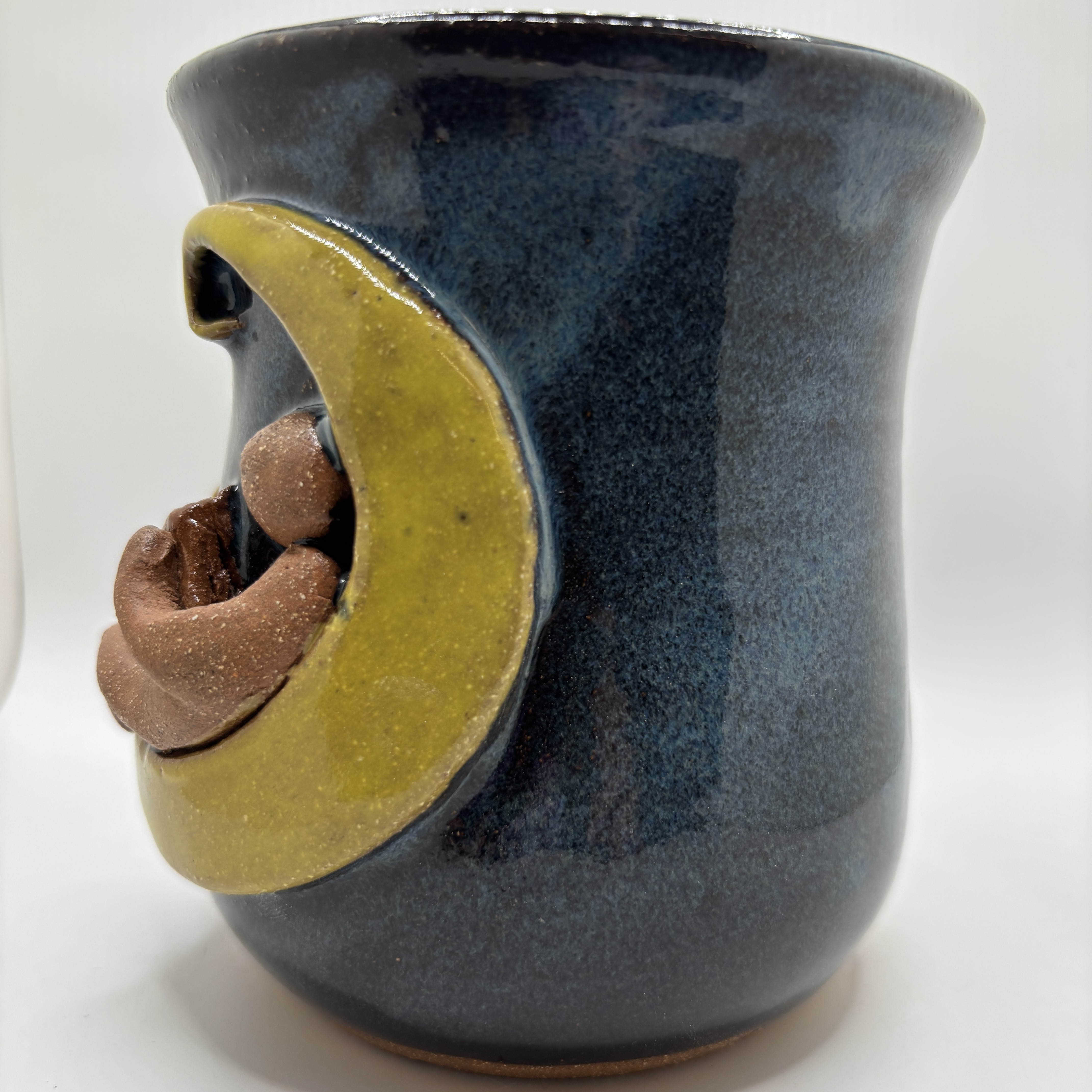 The perfect escape to the stars is just one sip away. This dreamy stoneware mug is hand-carved with a charming scene: a relaxed man sitting comfortably on a glowing crescent moon, legs dangling, completely lost in the pages of a good book. Every detail—the moon’s gentle curve, the man’s peaceful pose, and the open book—feels like a quiet midnight adventure. Finished in our rich dark blue glaze, deep and velvety like a clear night sky, it wraps the entire mug in a serene, starry glow from rim to base. Whether you’re savoring your morning coffee, afternoon tea, or late-night cocoa, this mug turns every drink into your own personal lunar reading nook. One-of-a-kind and made for book lovers, dreamers, stargazers, and anyone who believes the best stories happen under the moon. Your new favorite mug is ready to take you to the stars.