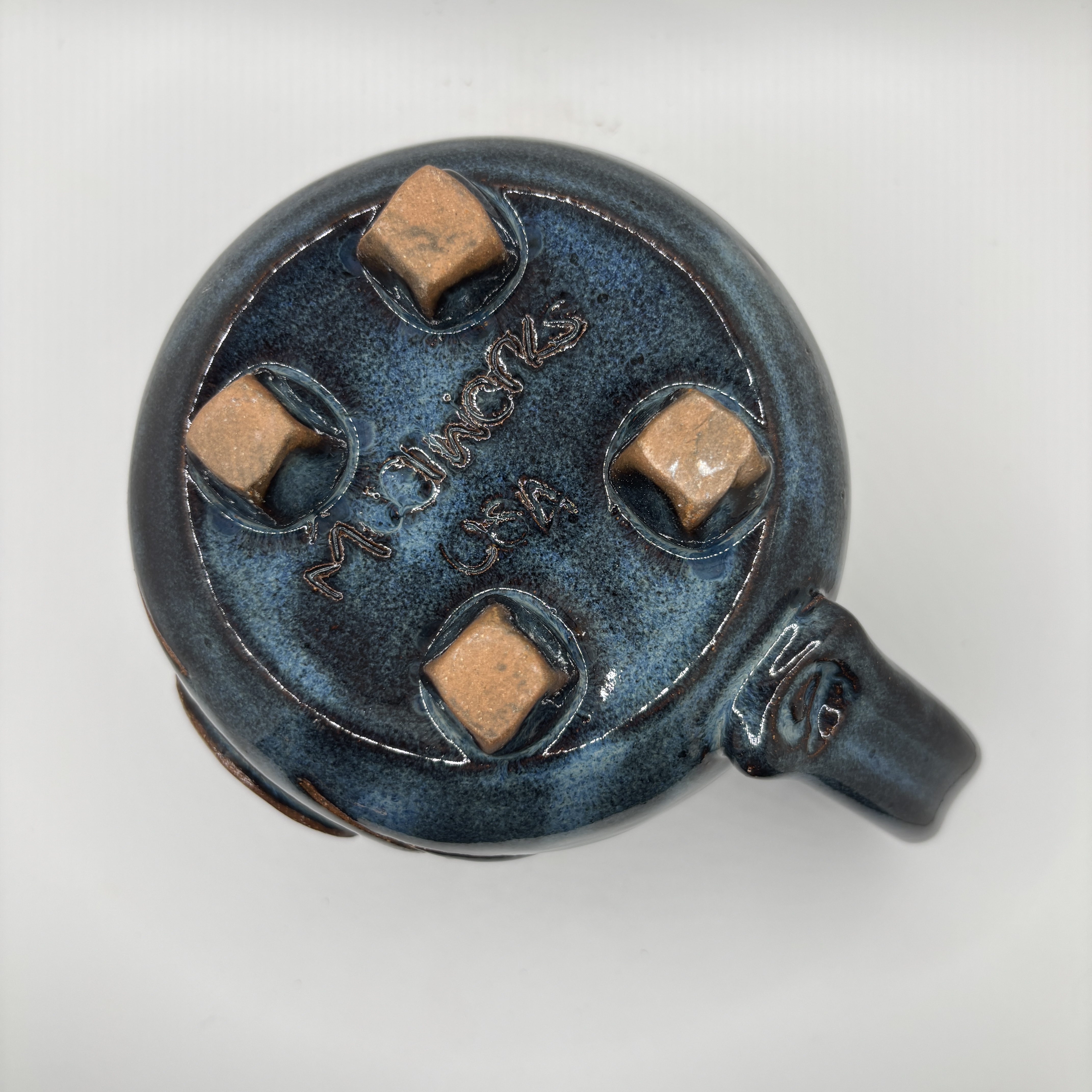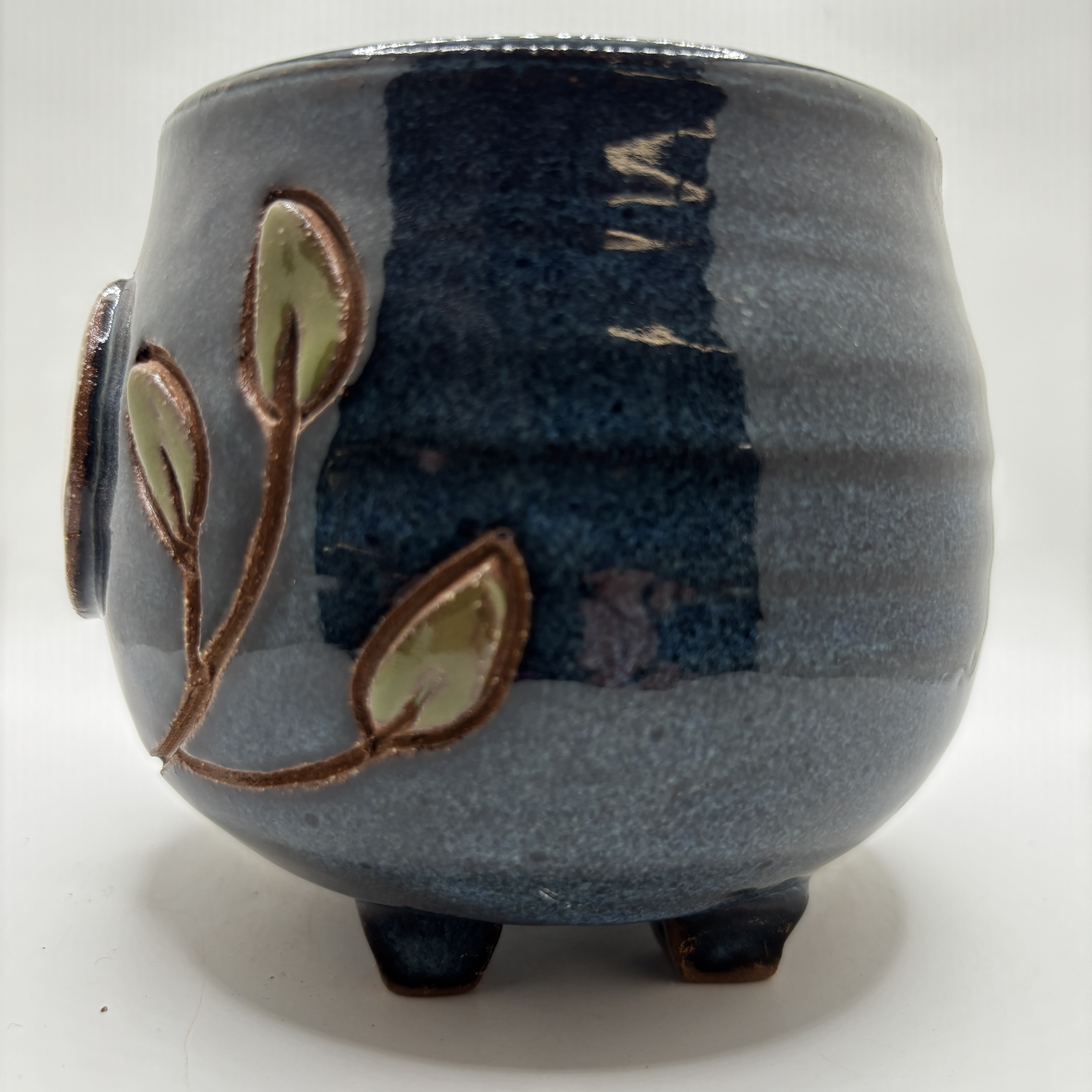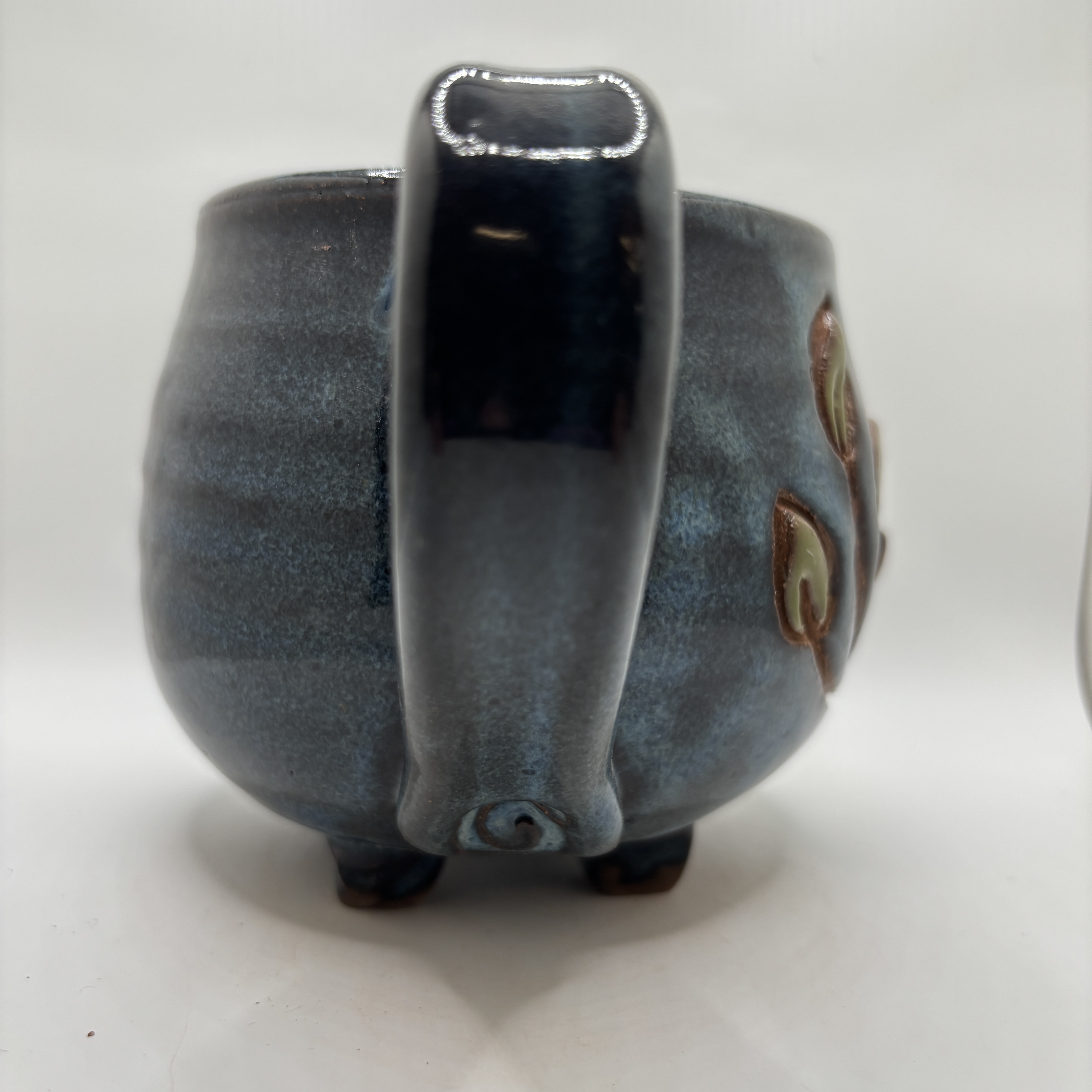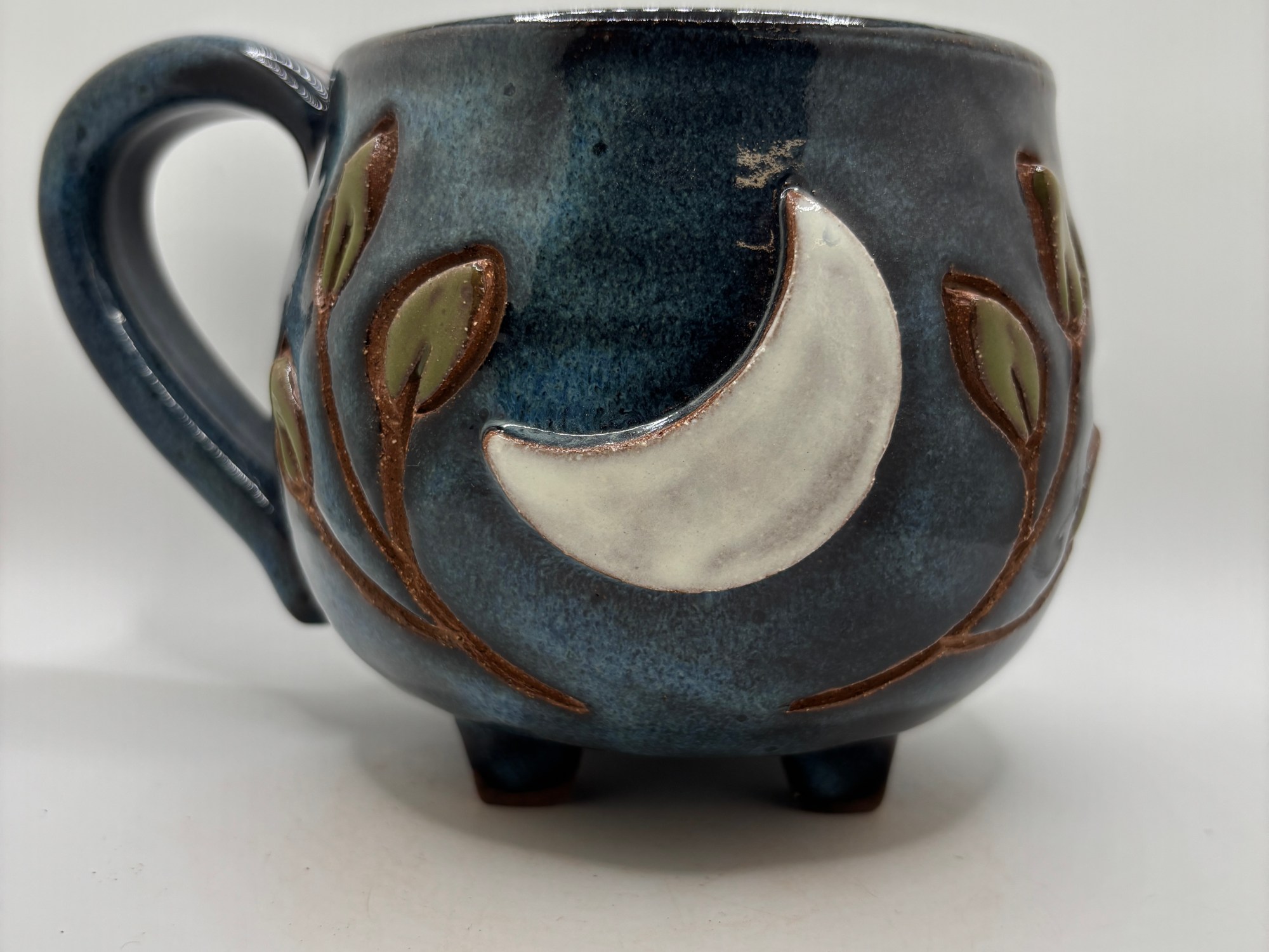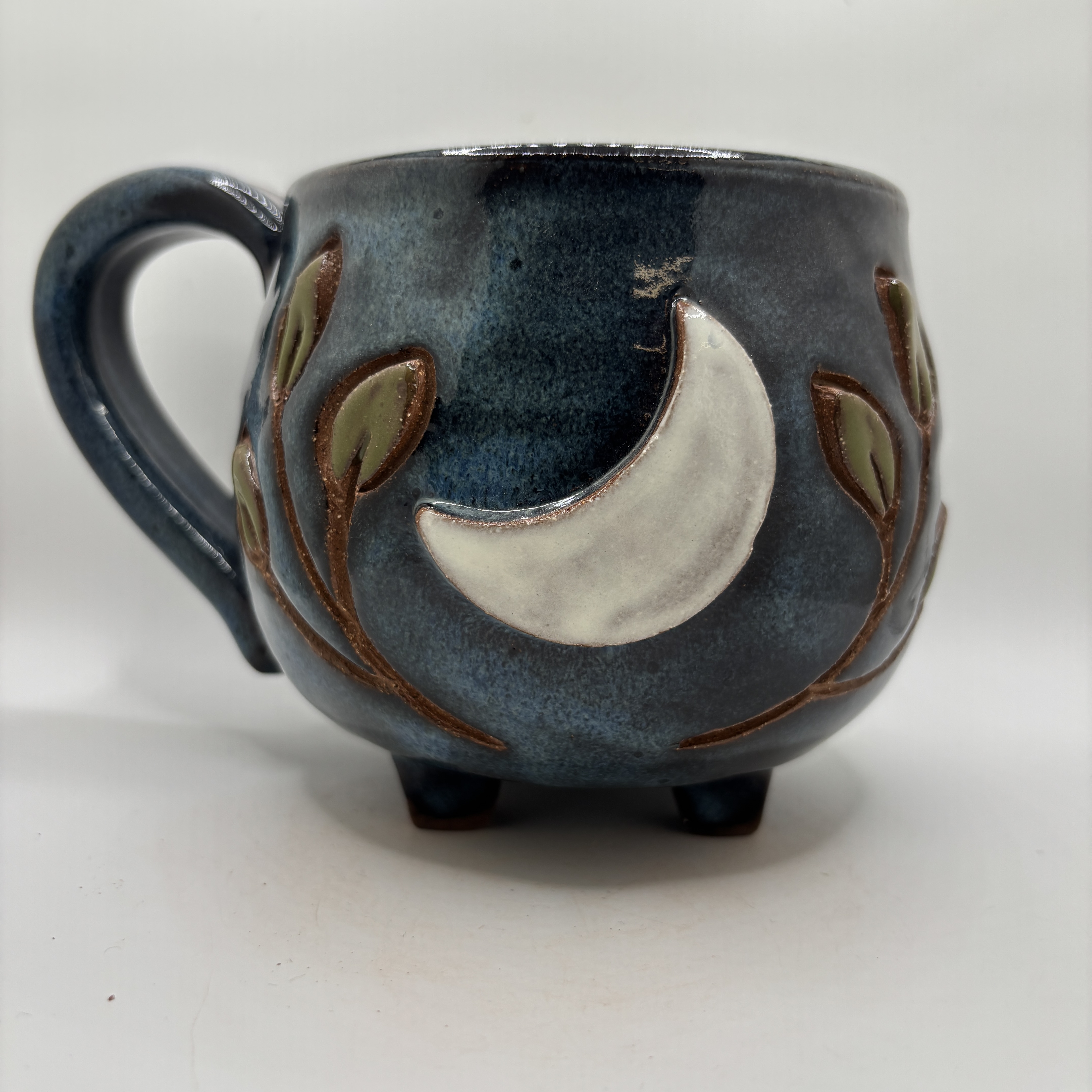 A moon and leaves added on a dark blue cauldron mug, Stoneware. 16 oz.