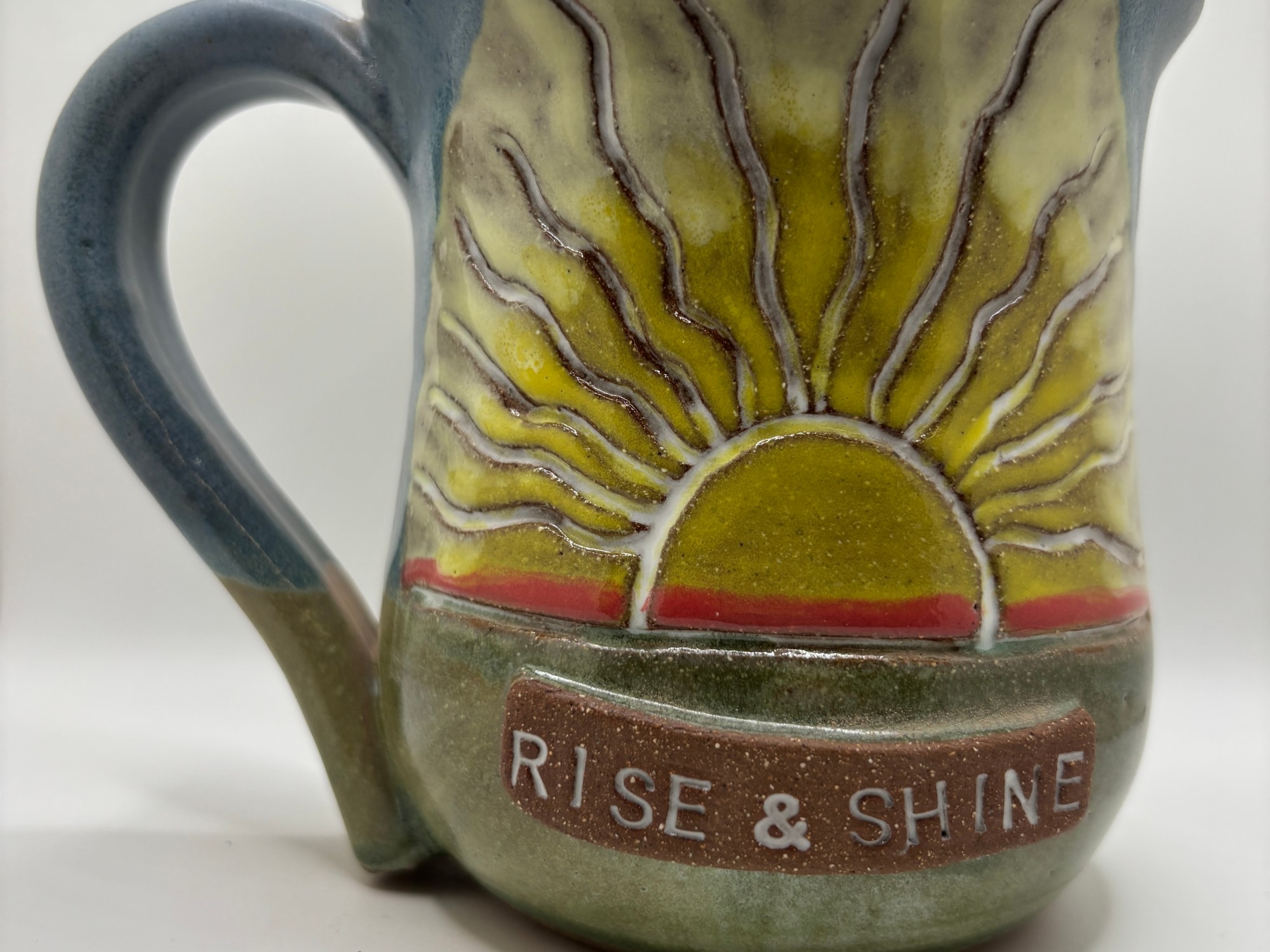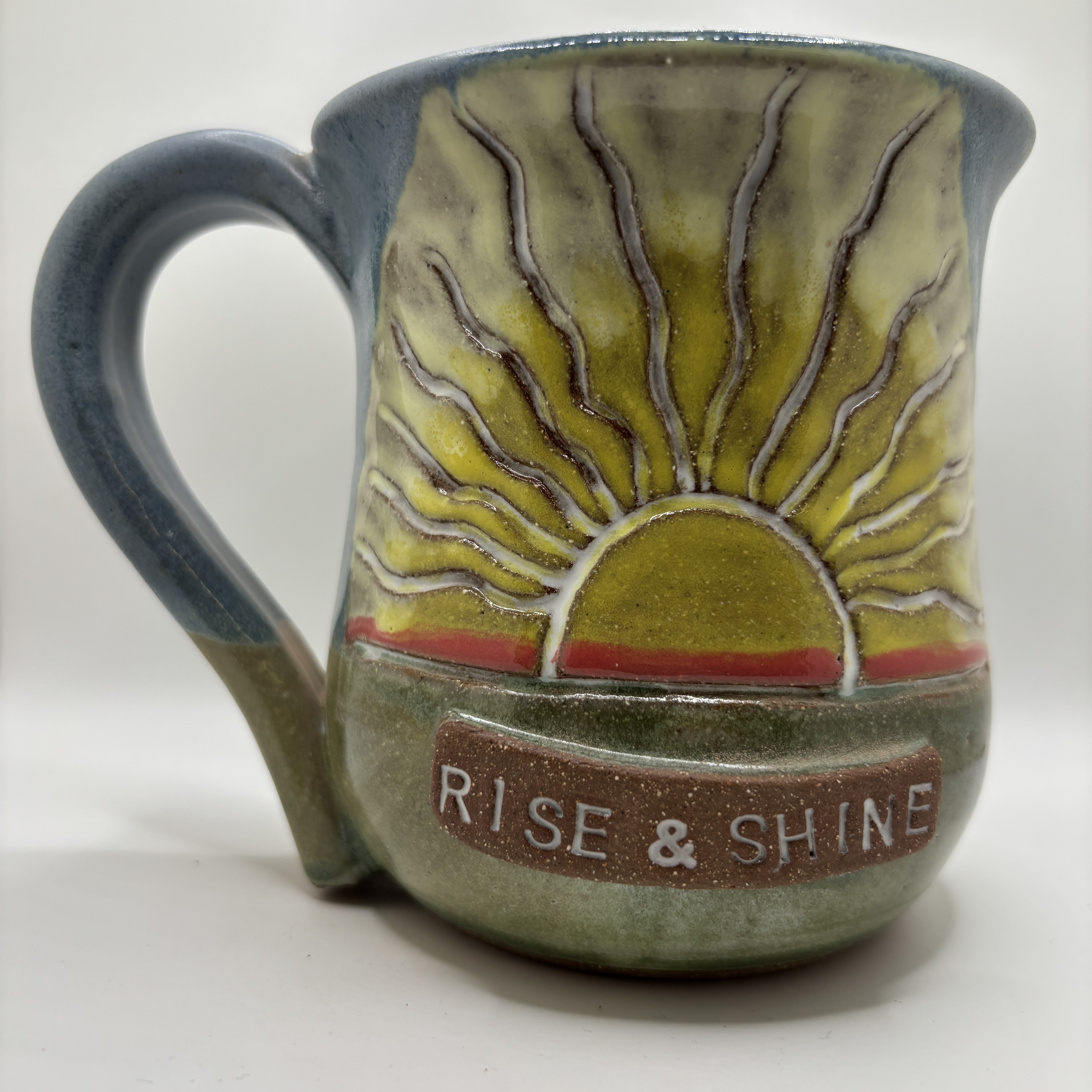 Wake up to pure morning joy with this uplifting handmade ceramic mug! A beautifully carved sun rises proudly over the horizon, painted in radiant golden tones to capture a breathtaking sunrise, while the cheerful words “Rise and Shine” glow just below. The entire piece is finished in our lovely blue and green glaze—soft sky blues blending into fresh greens that make the whole sunrise shimmer like the first light of a perfect day.Every mug is thrown, sculpted, painted, and glazed entirely by hand, so yours will be wonderfully one-of-a-kind. The smooth, food-safe finish feels warm and inviting in your hands while keeping your coffee, tea, or matcha perfectly hot.Start every day with a little burst of sunshine straight from your mug. This cheerful piece is ready to light up your mornings and your mood—one happy sip at a time!