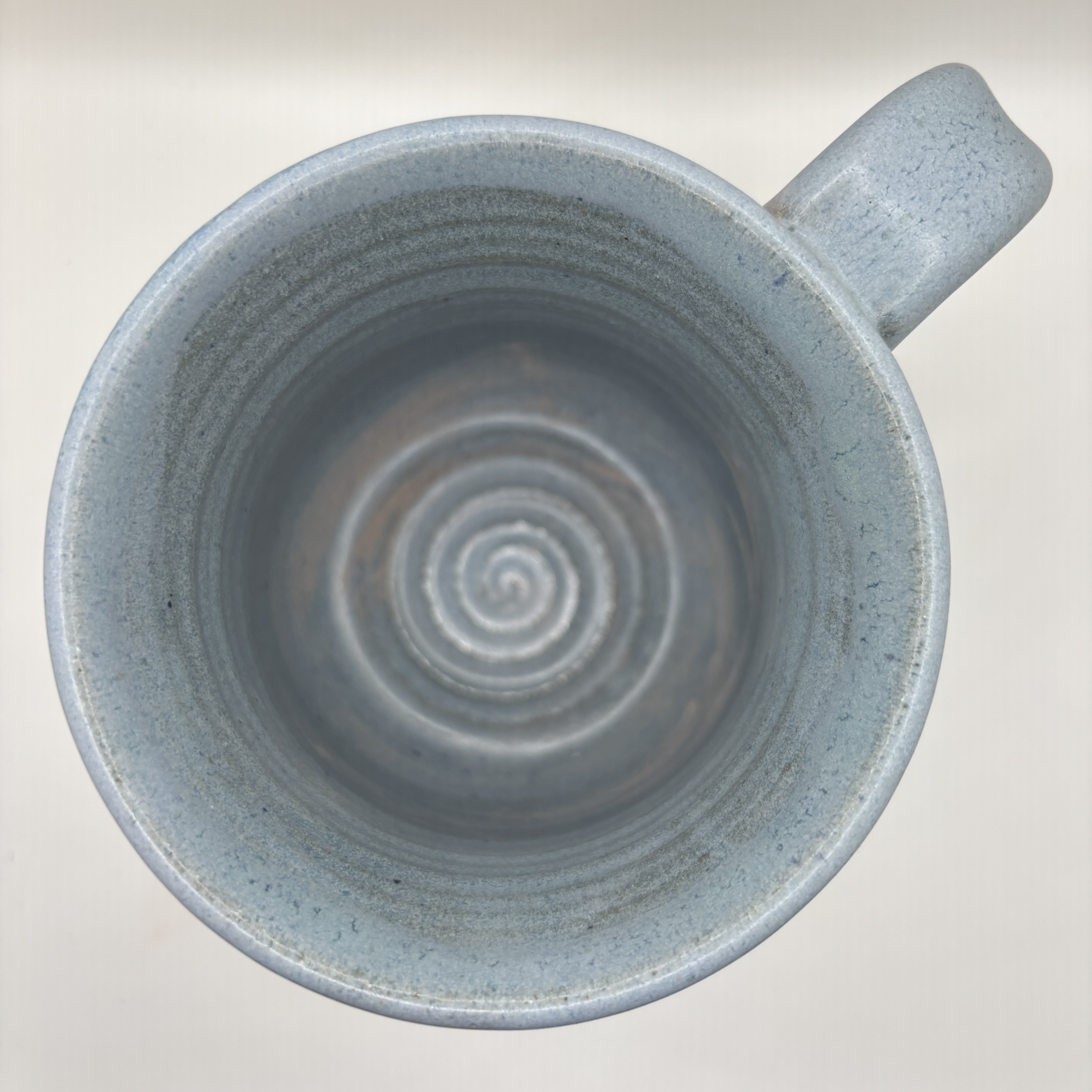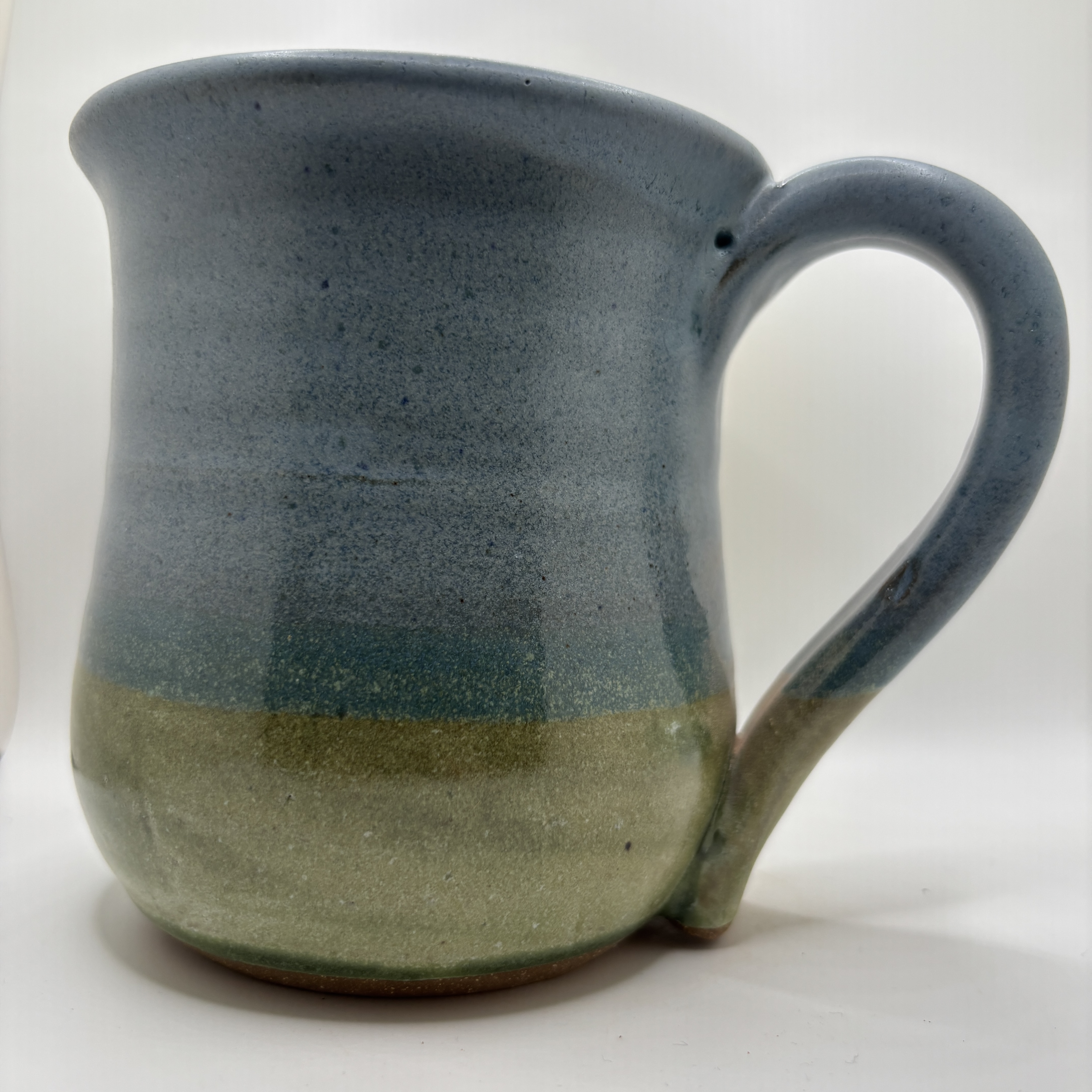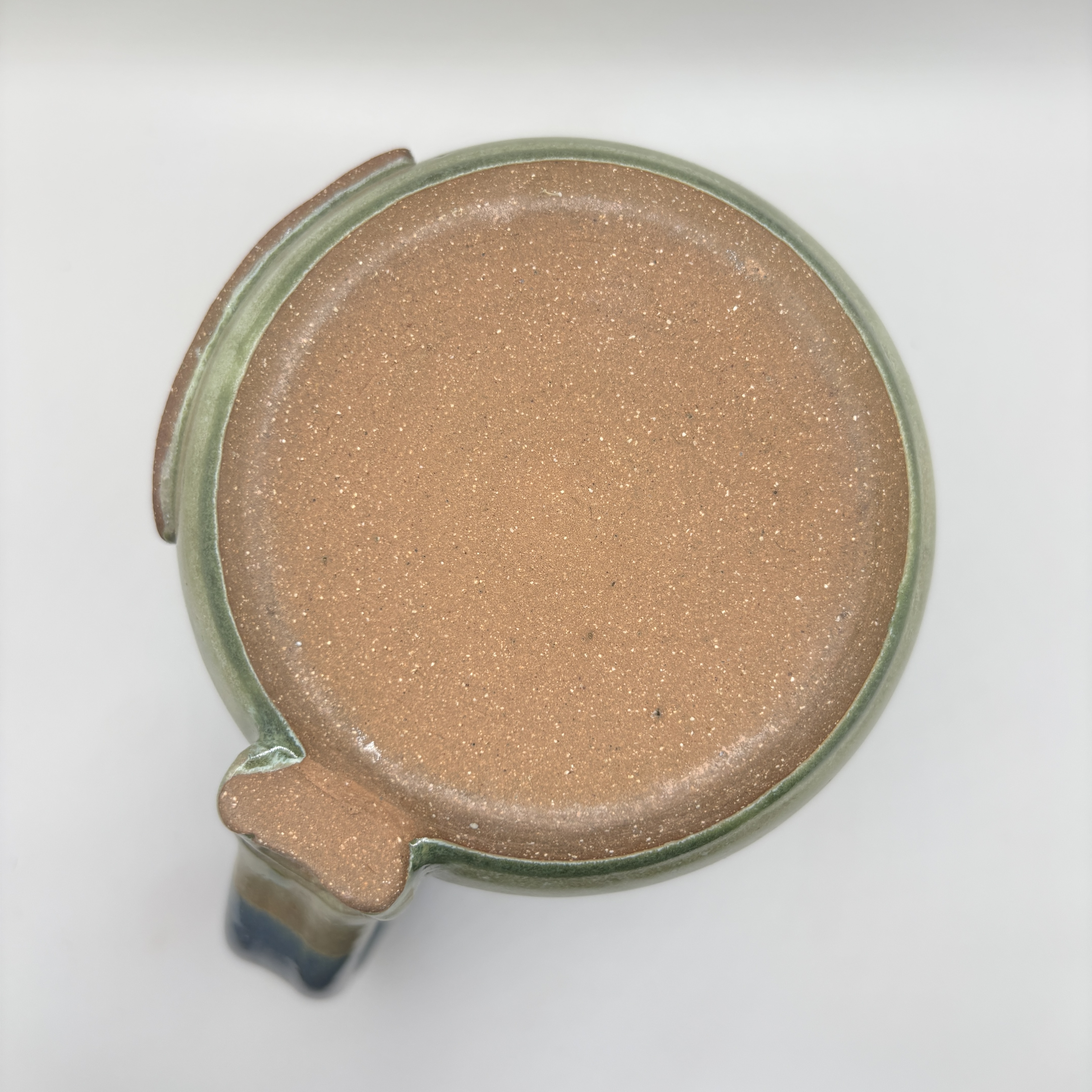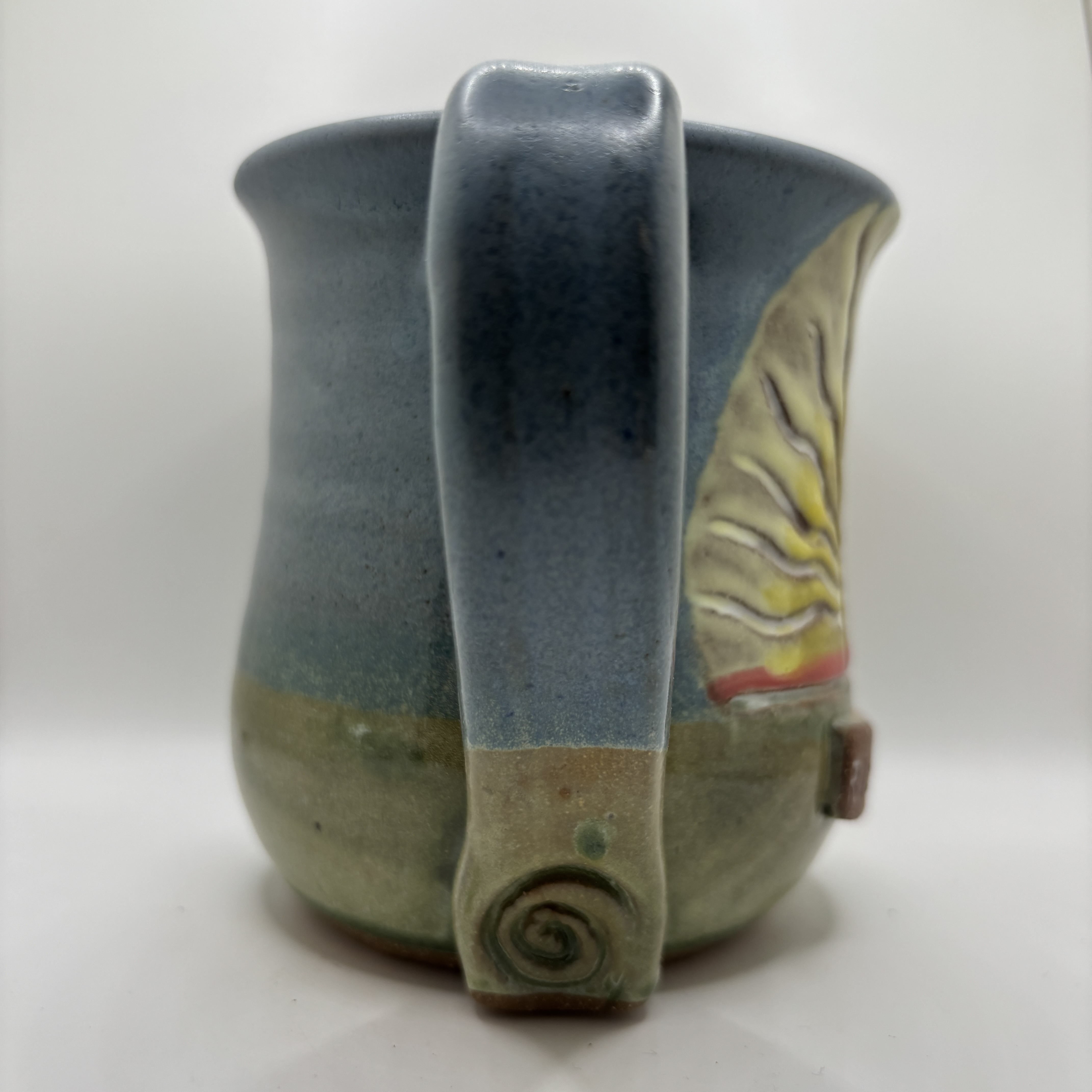 A carved sunset on a green and blue mug, Stoneware. 16-18 oz.