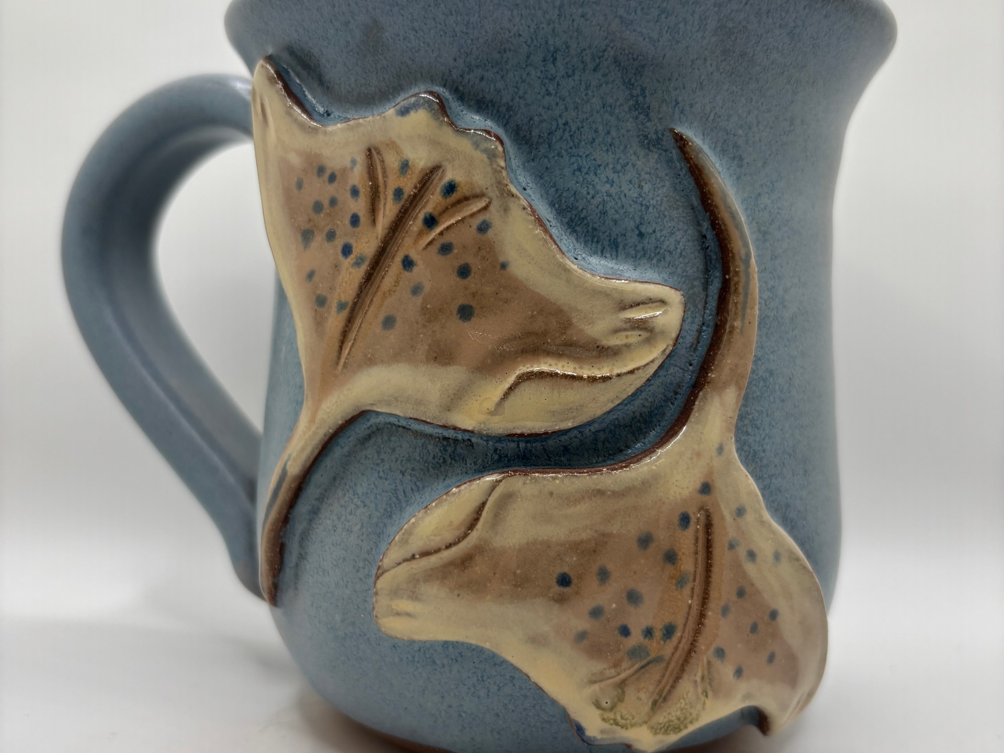 Two sting rays on a light blue mug, Stoneware. 16-18 oz.