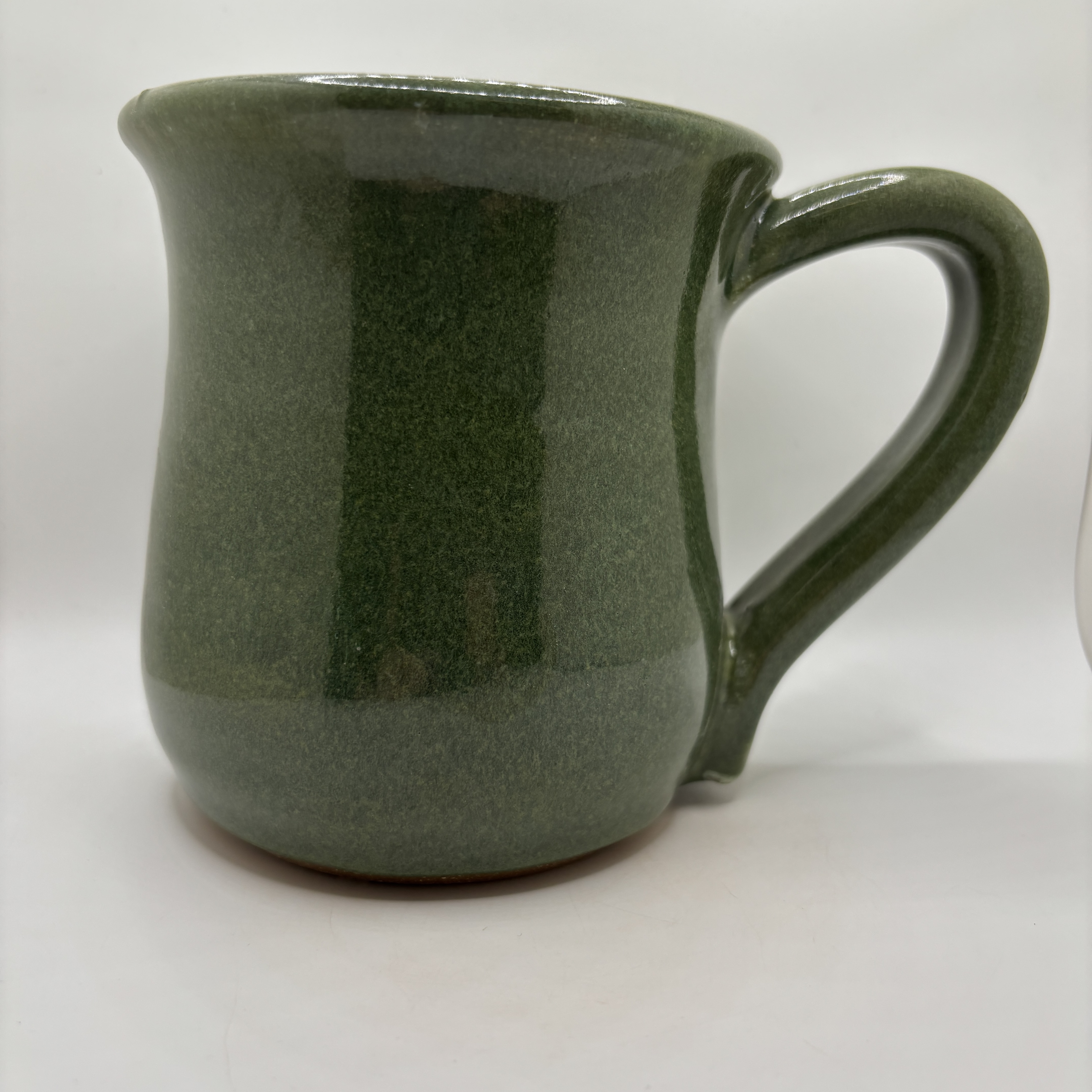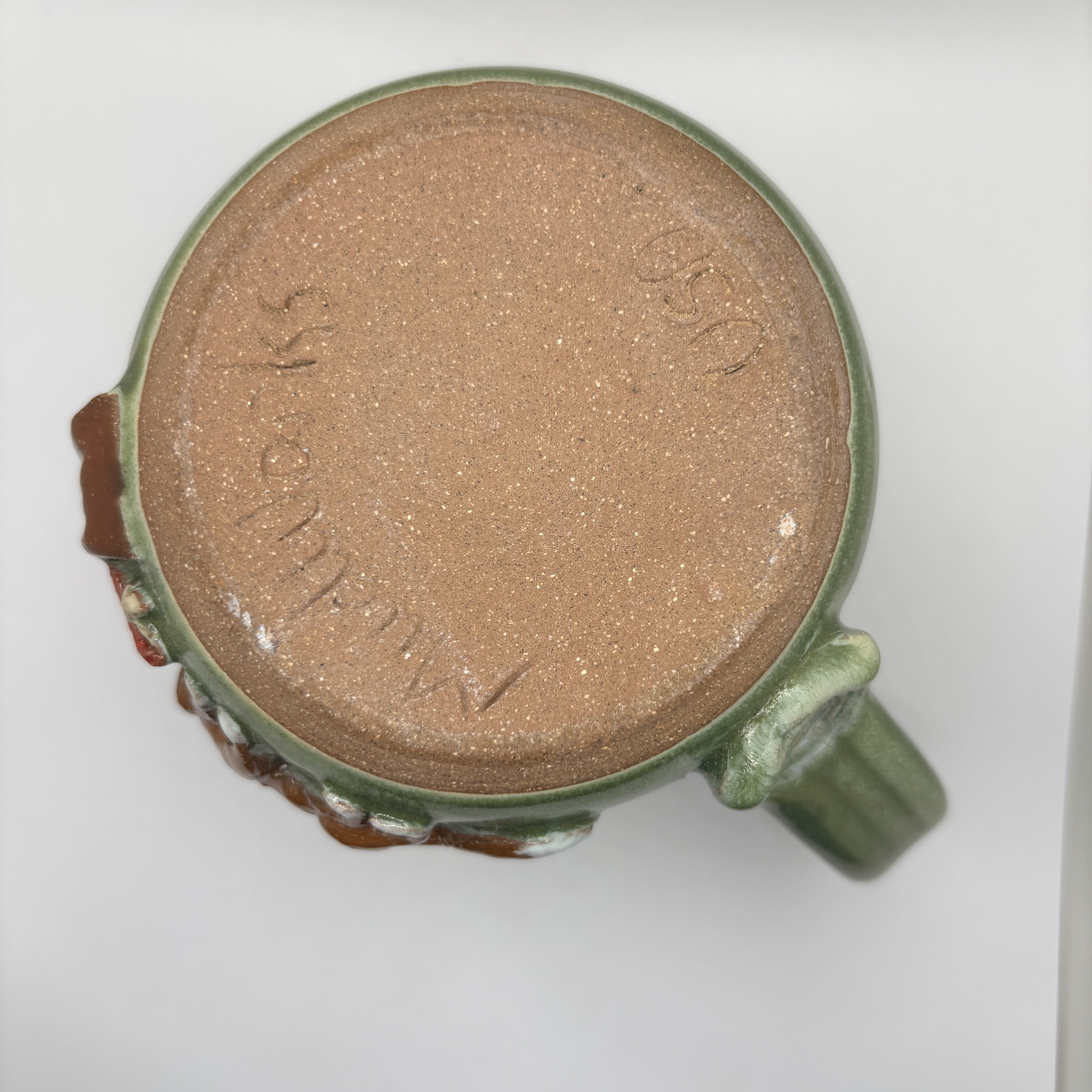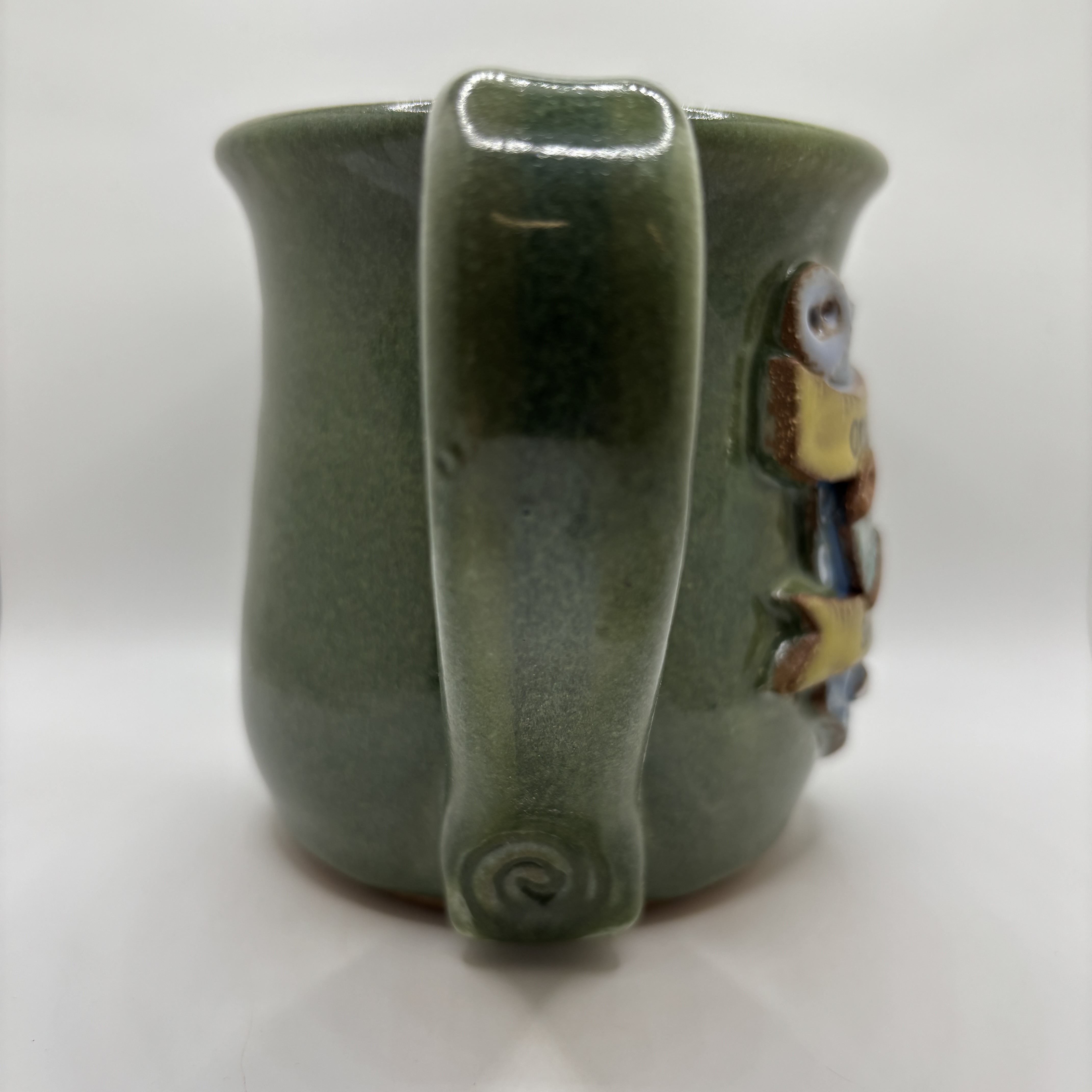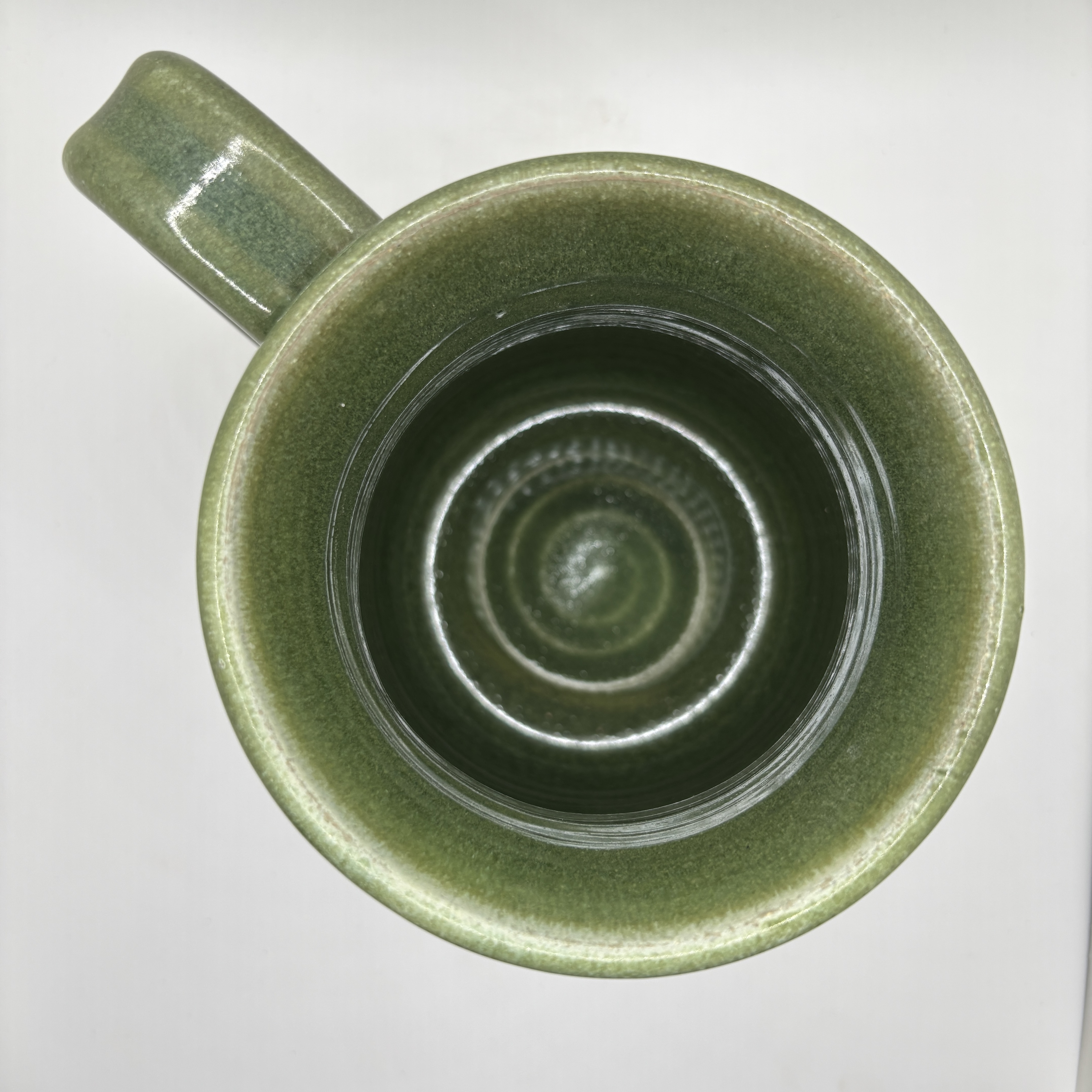 A pocket stitched with sewing gear on a green mug, Stoneware. 16-18 oz.