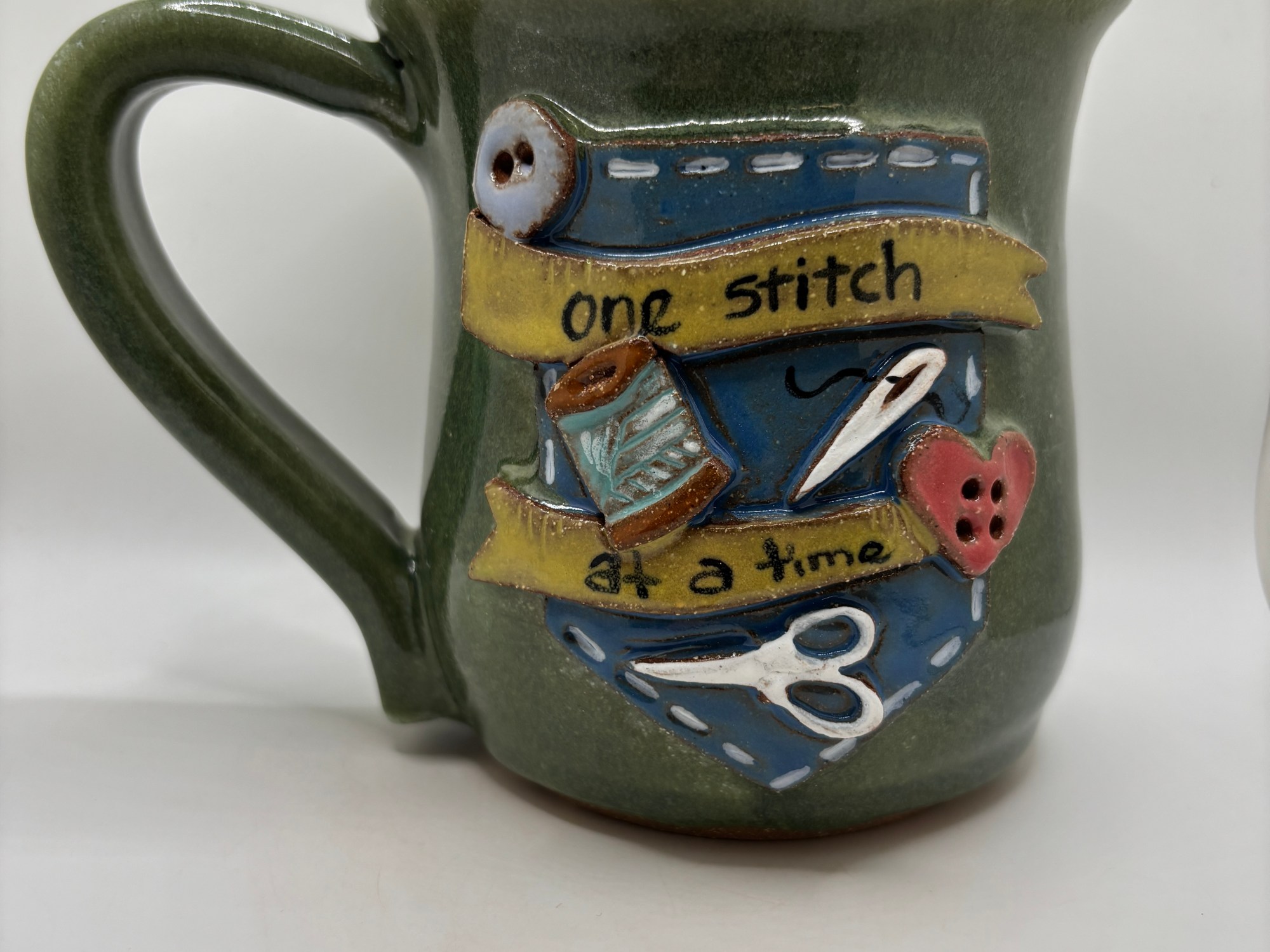 Take it one stitch at a time… and let your coffee help. This charming stoneware mug is hand-carved with the sweetest little pocket right on the front, just like the one on your favorite sewing apron. Across the pocket, the encouraging words “Just One Stitch at a Time” are hand-lettered in delicate script. Surrounding the pocket are all your favorite sewing tools—tiny scissors, a spool of thread, a needle threaded and ready, a thimble, and a few scattered pins—every detail lovingly etched so it feels like your whole sewing kit is right there with you. Whether you’re sipping coffee before a big project, tea during a relaxing stitch session, or cocoa while dreaming up your next creation, this mug turns every break into a gentle reminder that beautiful things happen one stitch at a time. One-of-a-kind and made for sewists, quilters, makers, and anyone who knows the joy (and patience) of handmade. Your new favorite mug is ready to stitch its way into your daily routine.