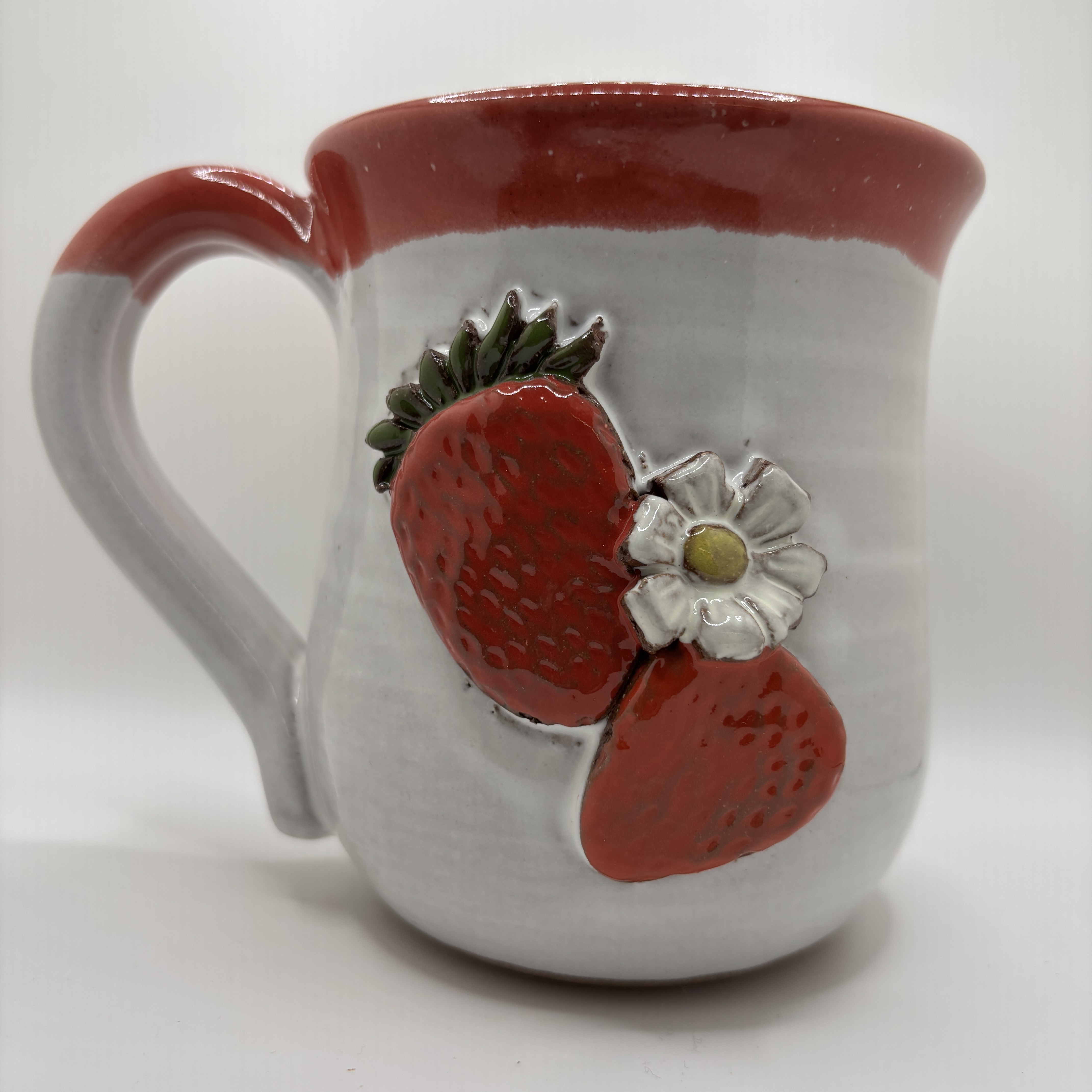 Sip your coffee, tea, or favorite lemonade from this cheerful handmade ceramic mug and let two plump strawberries with a delicate blooming flower bring a burst of garden joy! Expertly sculpted and glazed in our pure white base topped with a vibrant red glaze that makes the strawberries glow with juicy color and creates a gorgeous, warm overlap blush on every petal and leaf. Each mug is thrown, sculpted, and glazed entirely by hand, so yours will be wonderfully unique. The smooth, food-safe finish feels cozy and comforting in your hands while keeping your drink perfectly warm. Bring home a little slice of summer sweetness. This mug is ready to make every sip feel like sunshine and fresh-picked happiness!