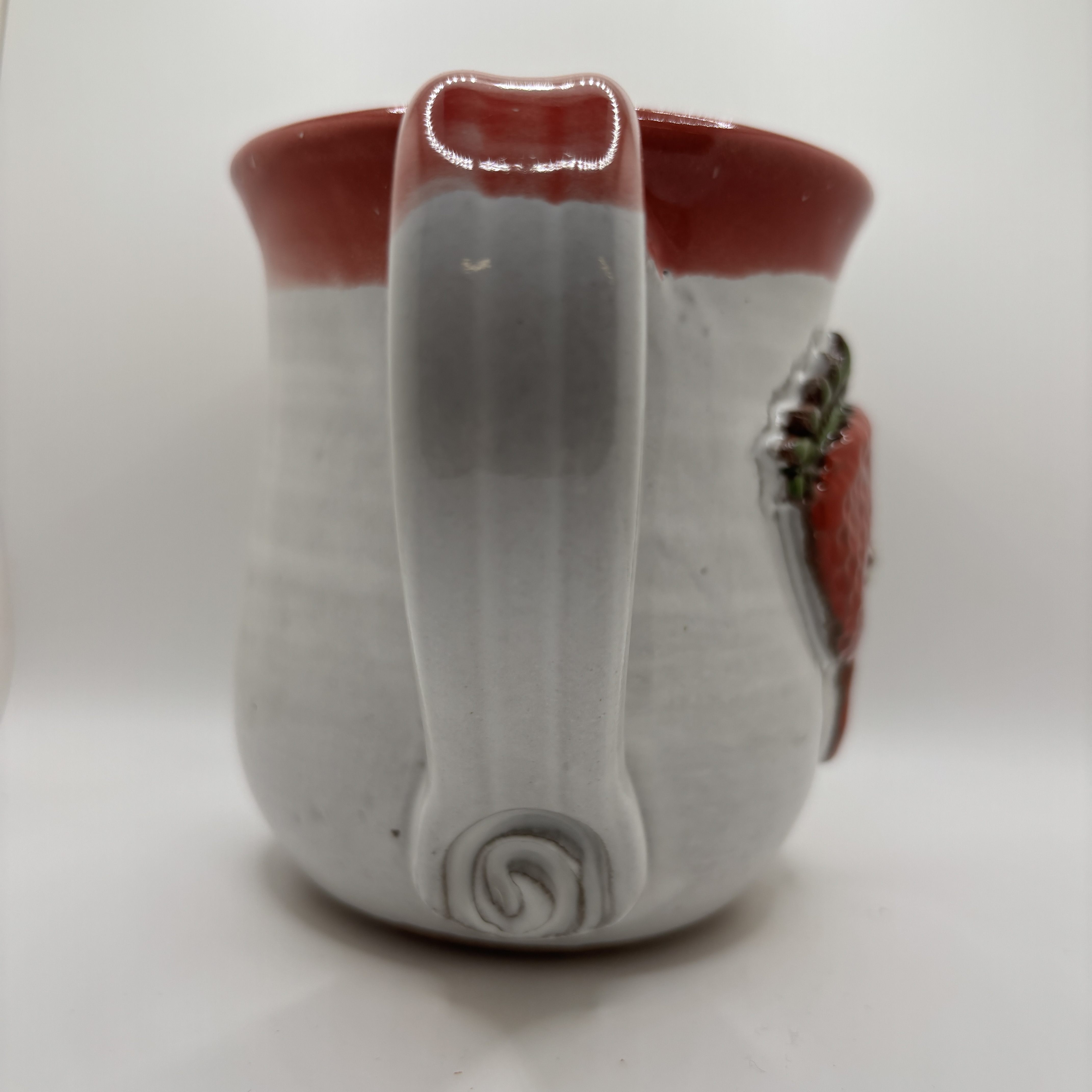 Strawberries on a white mug topped with red, Stoneware. 14-16 oz.