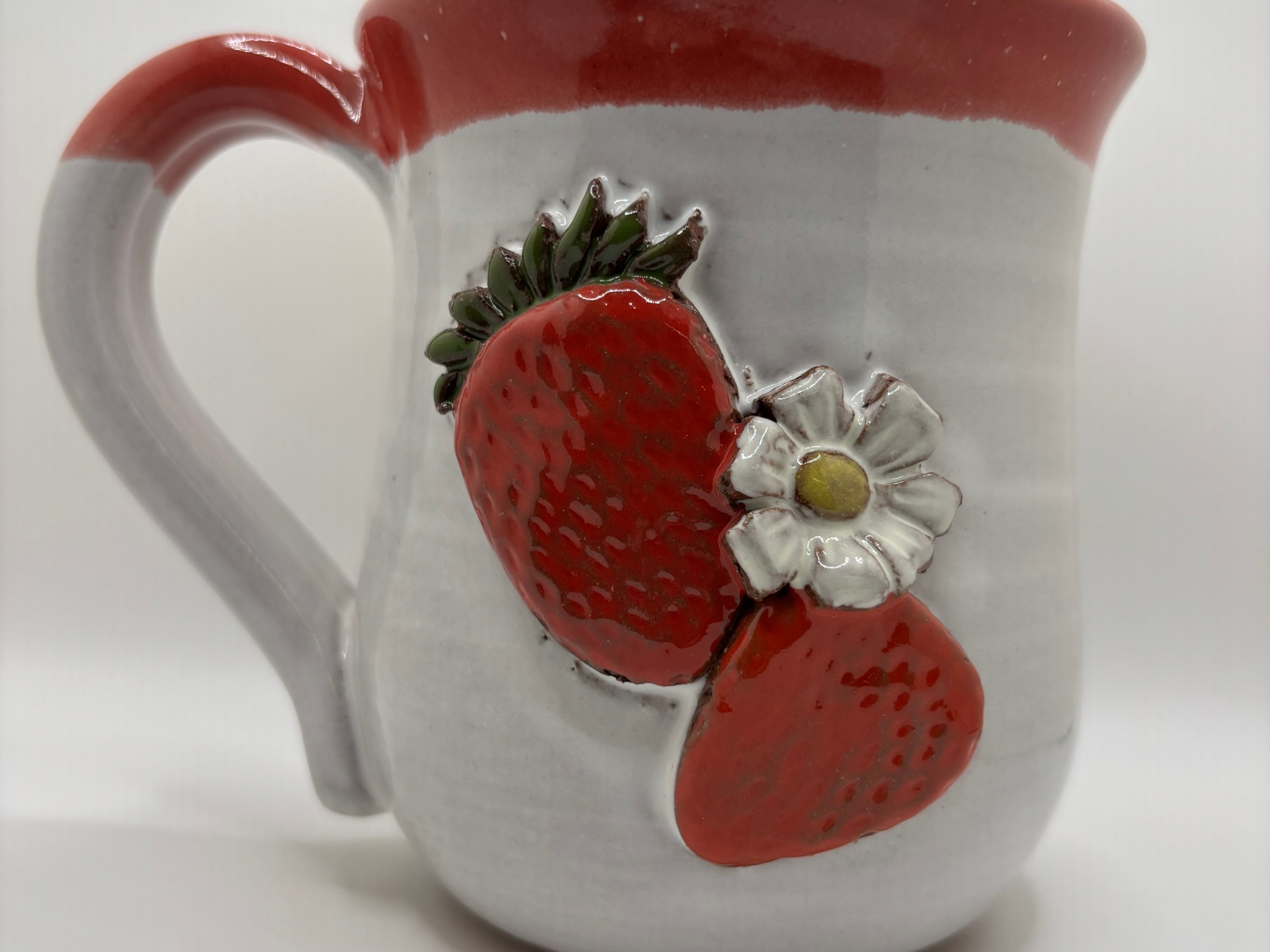Strawberries on a white mug topped with red, Stoneware. 14-16 oz.